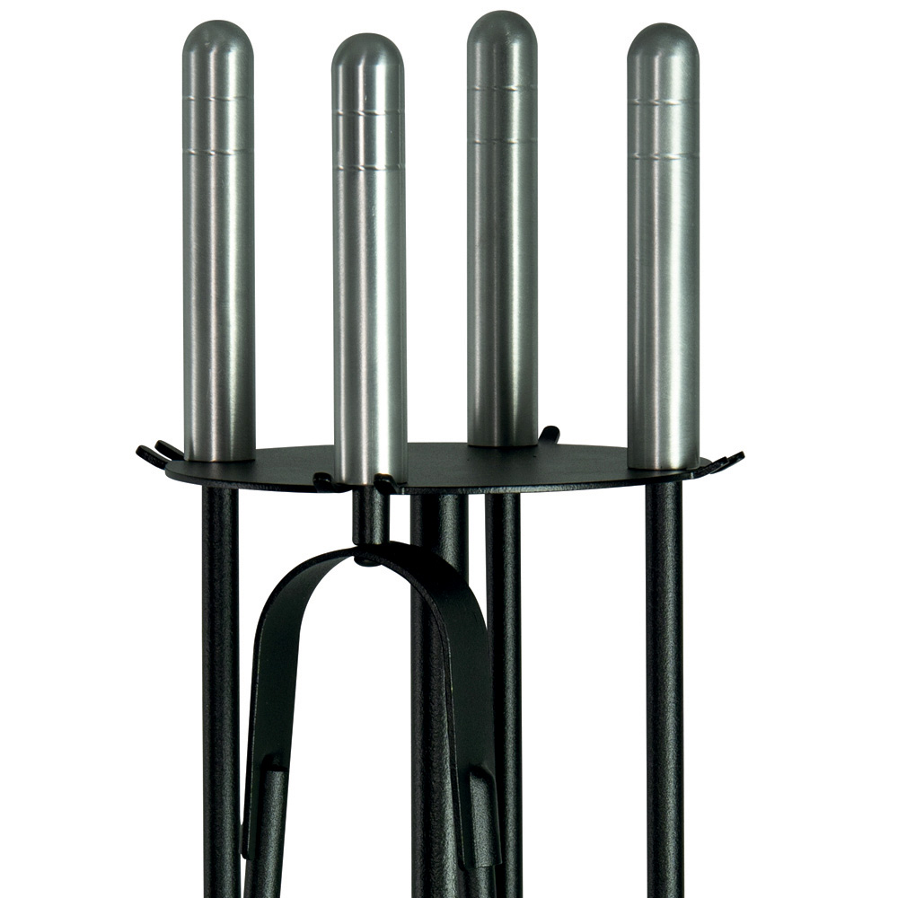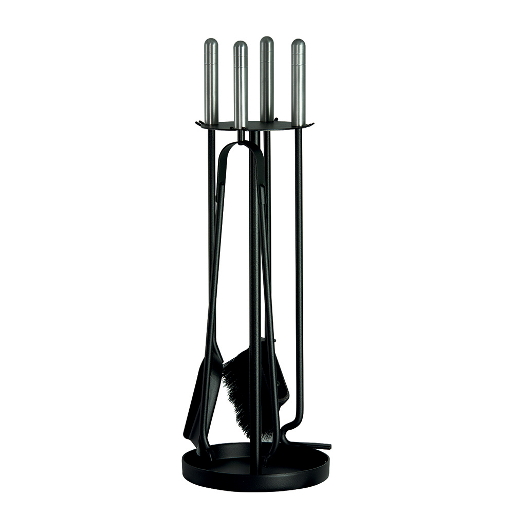 Vertikální podpěra nejenže zabírá málo místa, ale efektivně organizuje příslušenství, udržuje je uklizené a snadno dostupné. Kruhová základna shromažďuje veškeré zbytky nebo popel, který může spadnout při používání nářadí, a udržuje tak prostor kolem krbu čistý.