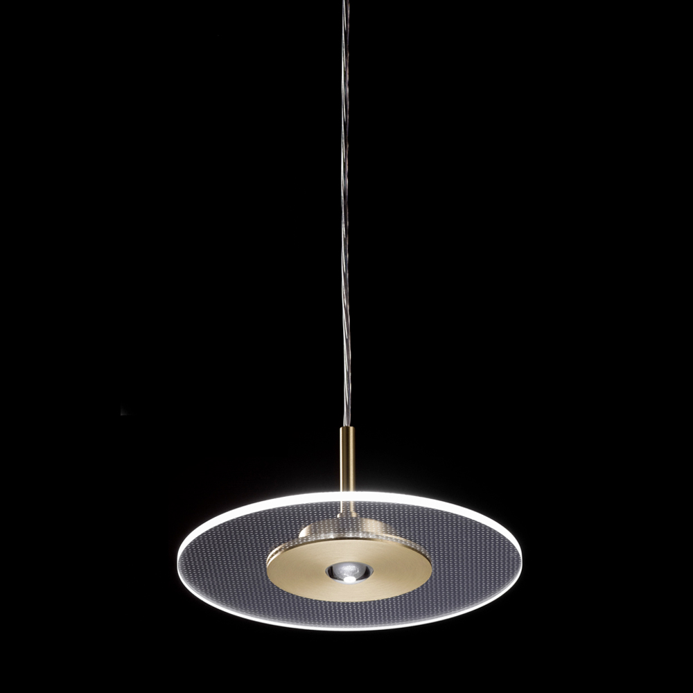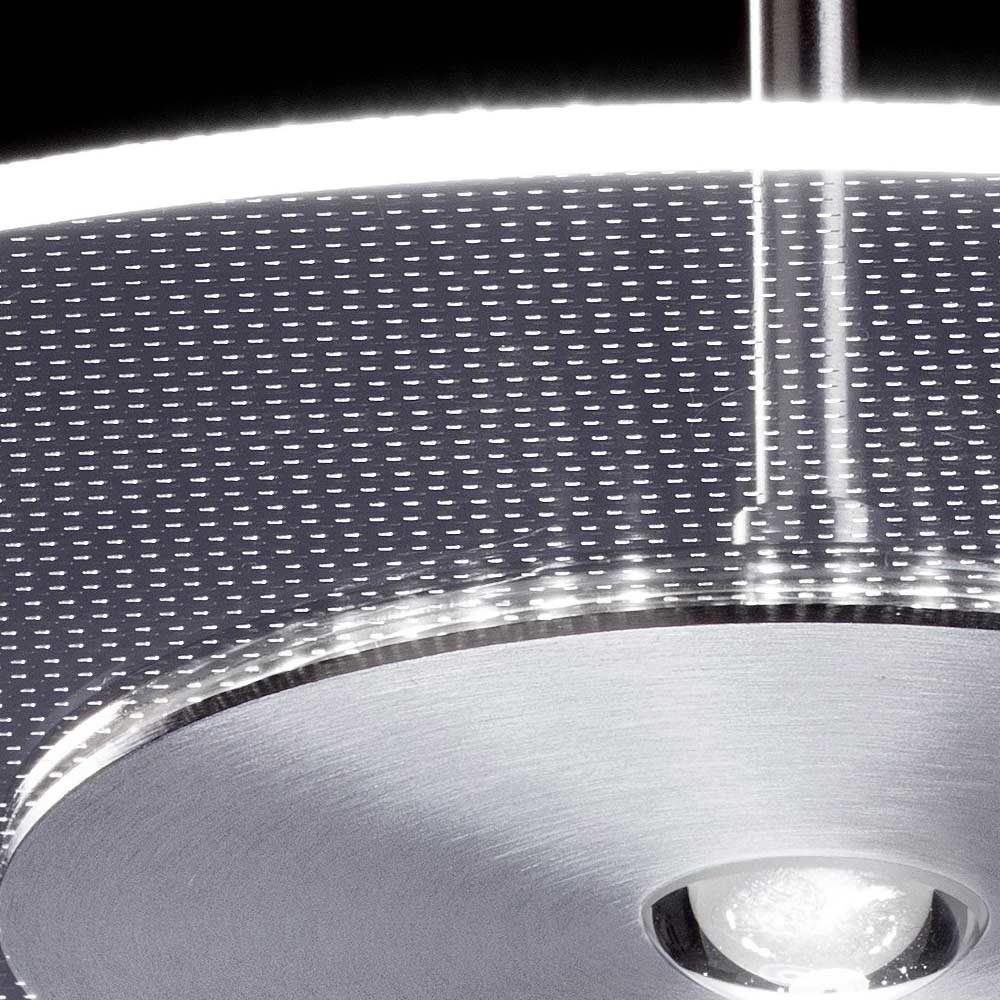 Interiérový lustr vyrobený s kovovým jádrem a plexisklovou (PMMA) strukturou s mikrotečkovým zpracováním, které umožňuje větší rozptyl světla.