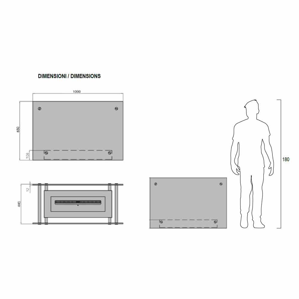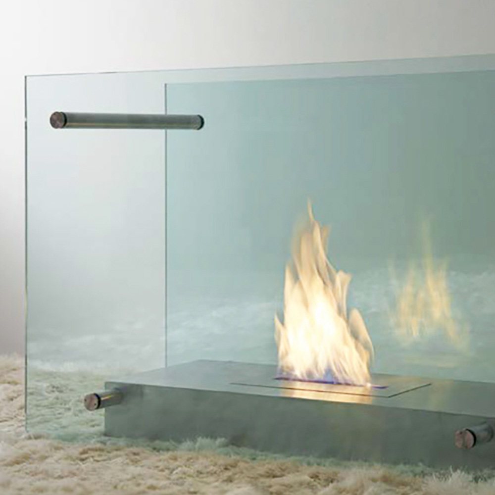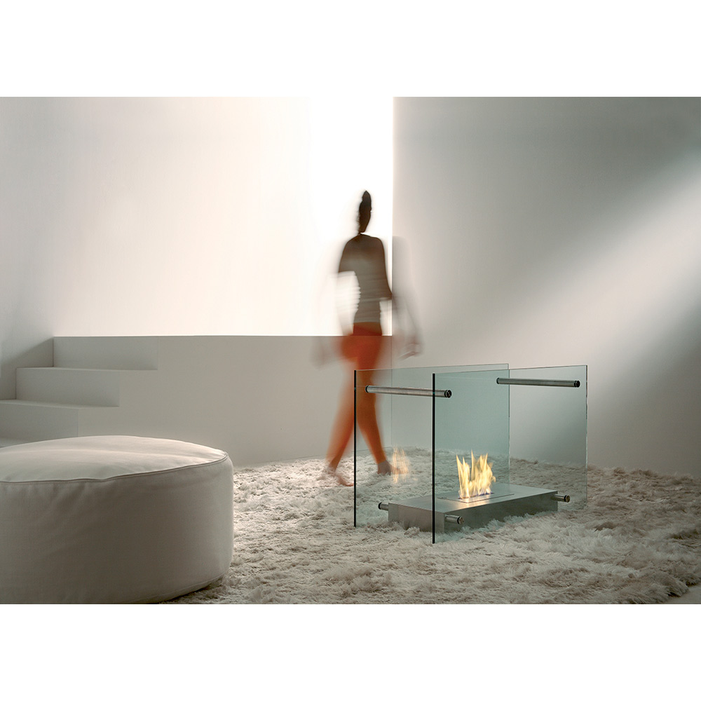 Podlahový krb na bioethanol s moderním designem z oceli a skla, pro vnitřní použití, vyrobený v Itálii.