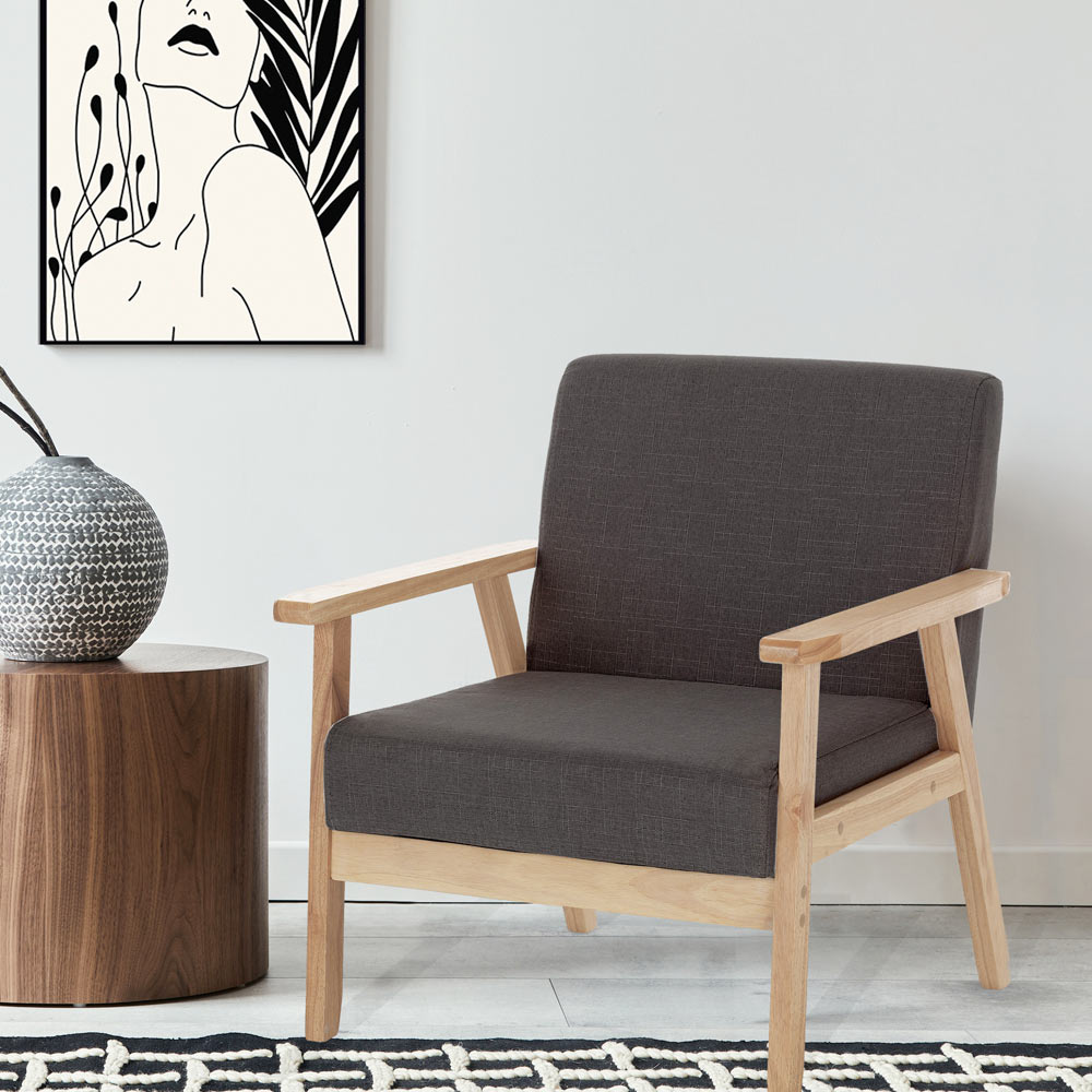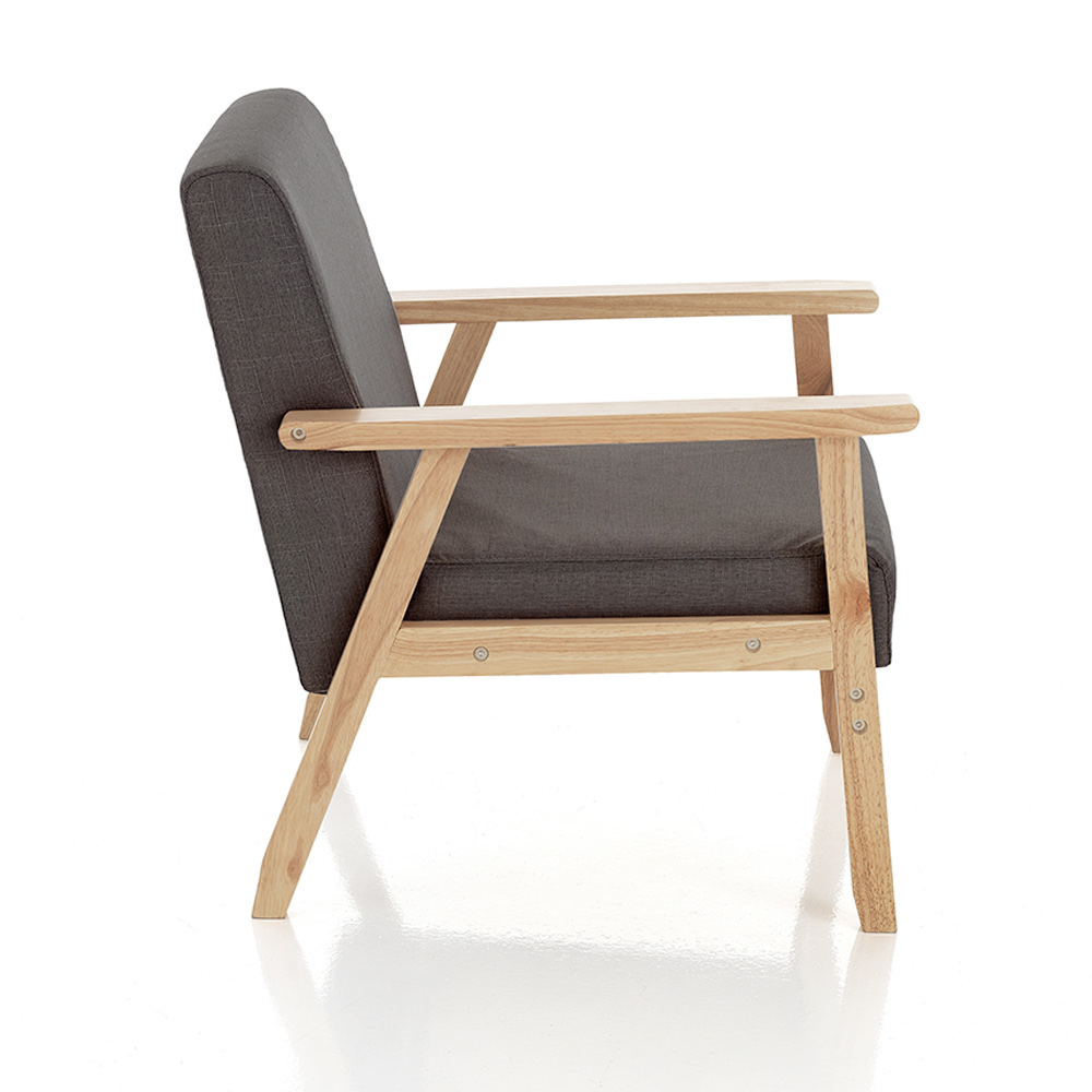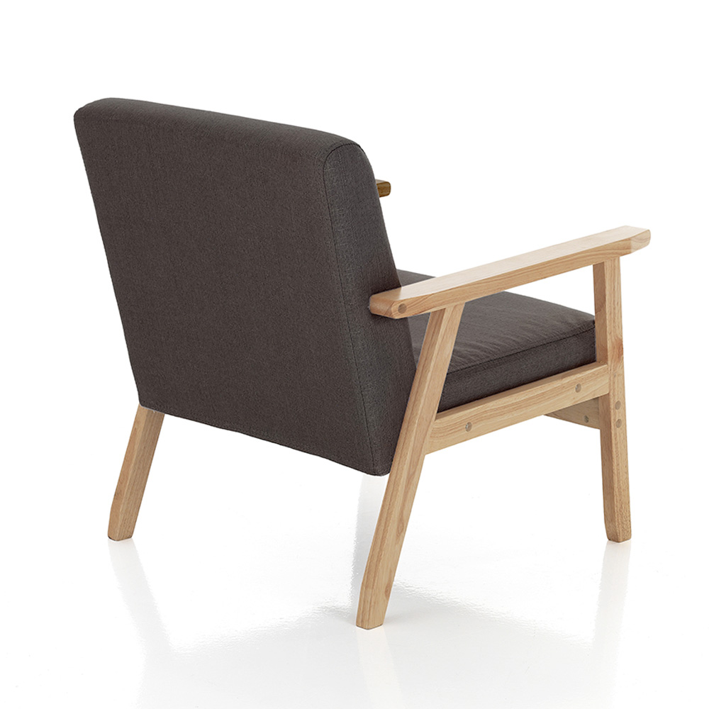 Toto křeslo kombinuje eleganci a pohodlí s čistým a moderním designem. Vyrobeno se strukturou masivního dřeva , nabízí výjimečnou odolnost a hřejivý vzhled, který vybízí k relaxaci. Kontrast s tmavě šedým látkovým čalouněním dodává každému prostoru punc moderní sofistikovanosti .
