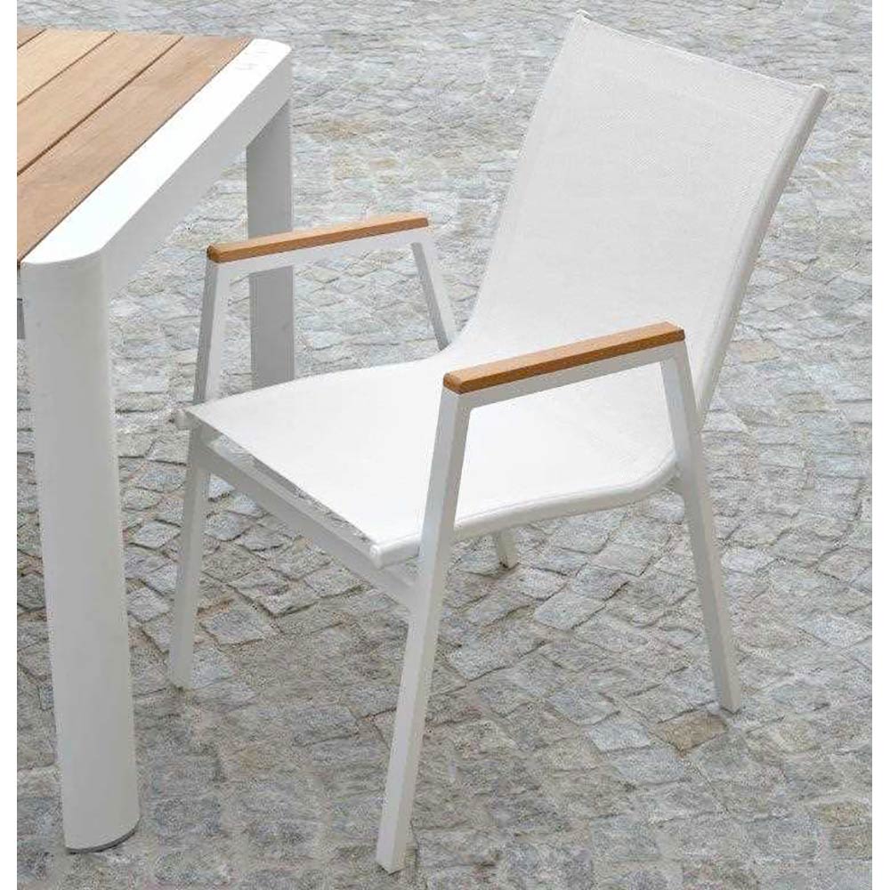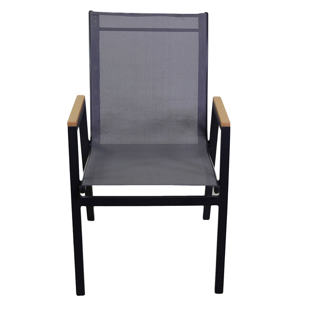 Toto práškově lakované křeslo s hliníkovým rámem kombinuje styl a funkčnost a je ideální pro doplnění každého moderního venkovního prostoru. Textilénová tkanina zajišťuje odolnost vůči povětrnostním vlivům a dlouhotrvající pohodlí, zatímco dřevěné vložky na područkách dodávají nádech tepla a elegance.