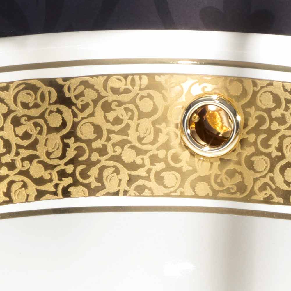 Koupelna vestavěná umyvadlo vyrobené v Itálii ručně vyráběné v ohnivém jílu, zdobené zlatým pruhem v reliéfu, dvěma copánky a 24k zlatým okrajem.