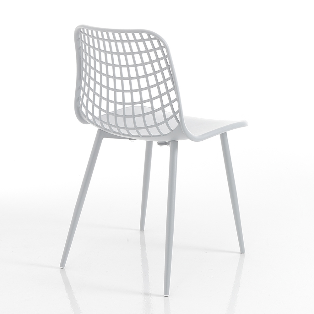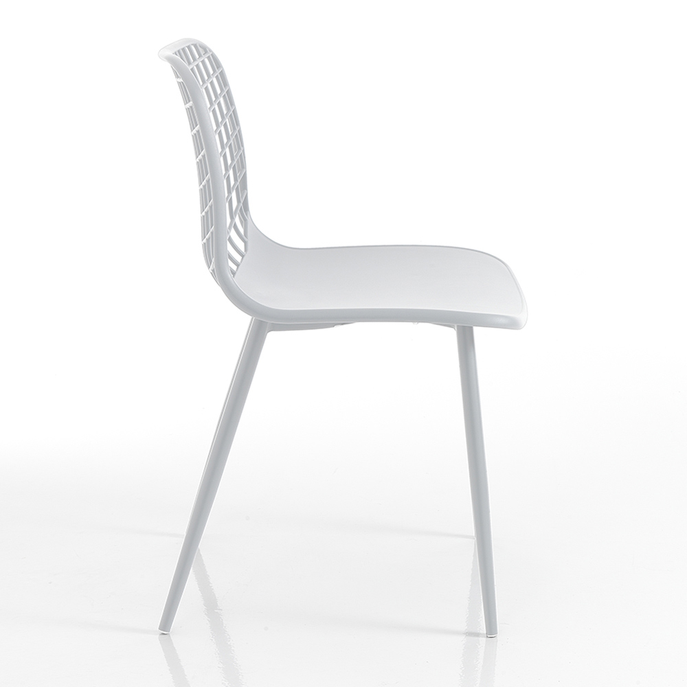 Kuchyňská židle se skořepinou z neprůhledného bílého polypropylenu a ocelovými nohami potaženými ochranným nátěrem pro exteriér v neprůhledné bílé. Jednoduchý a minimalistický sedák, jehož estetiku obohacuje a činí jedinečným zvláštní zpracování, které charakterizuje opěradlo a podtrhuje jeho jedinečnost. Výsledkem je obzvláště všestranná židle, proto ideální pro nejrozmanitější domácí prostředí, ale také pro smluvní prostory, jako jsou bary a restaurace, kde nábytku dodává punc originality.