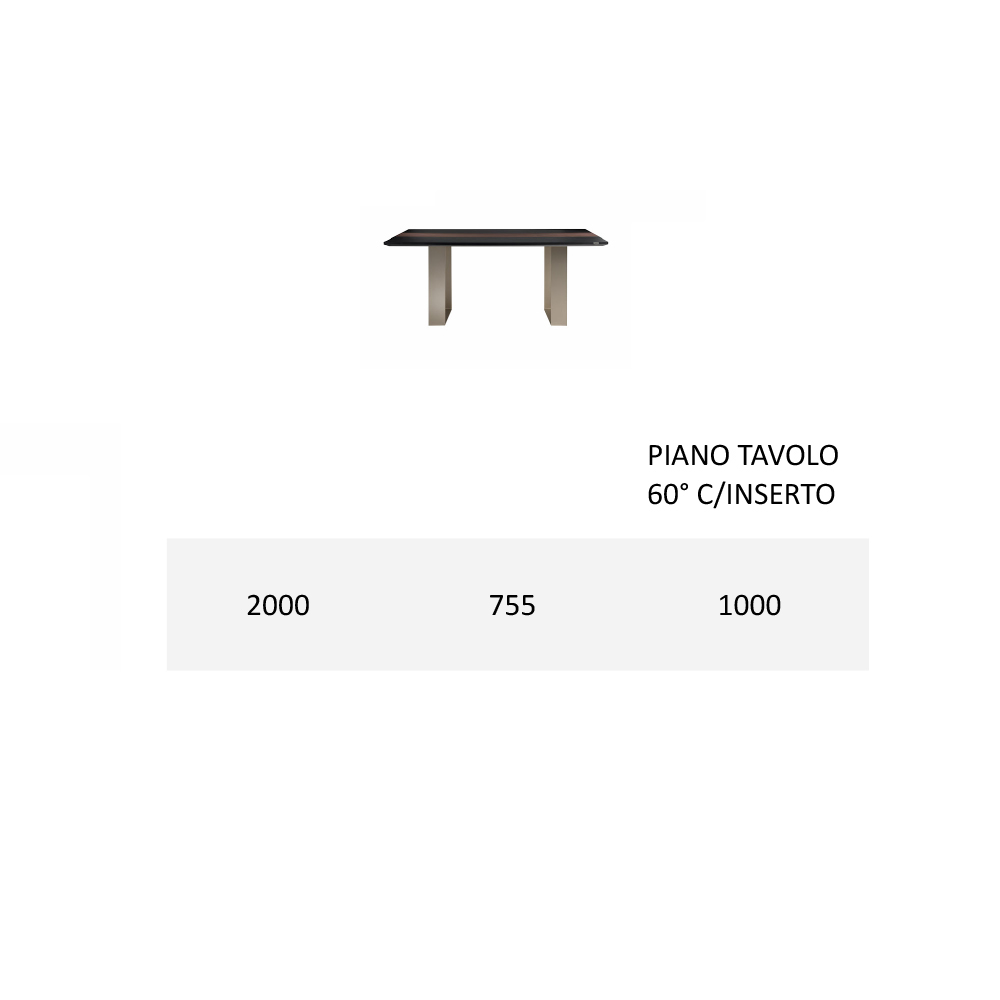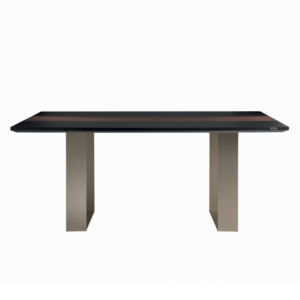 Jídelní stůl vyrobený v Itálii se skládá ze dvou železných nohou s niklovou povrchovou úpravou a obdélníkové desky z mdf s povrchovou úpravou dřevěné uhlí s horní vložkou z masivního dřeva s povrchovou úpravou mořený jasan. Doplněk s minimálním, ale neuvěřitelně moderním stylem, navržený tak, aby zásadním způsobem zařídil jakýkoli obytný prostor. Jeho estetika je obzvláště jednoduchá, vyznačuje se minimálními tvary, obdélníkovou horní částí spočívající na dvou nohách se zvláštním zpracováním, které přenáší dynamický a elegantní vizuální efekt.