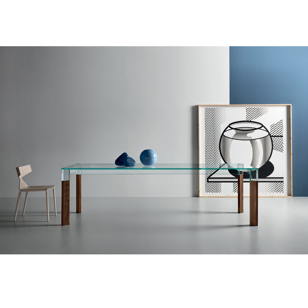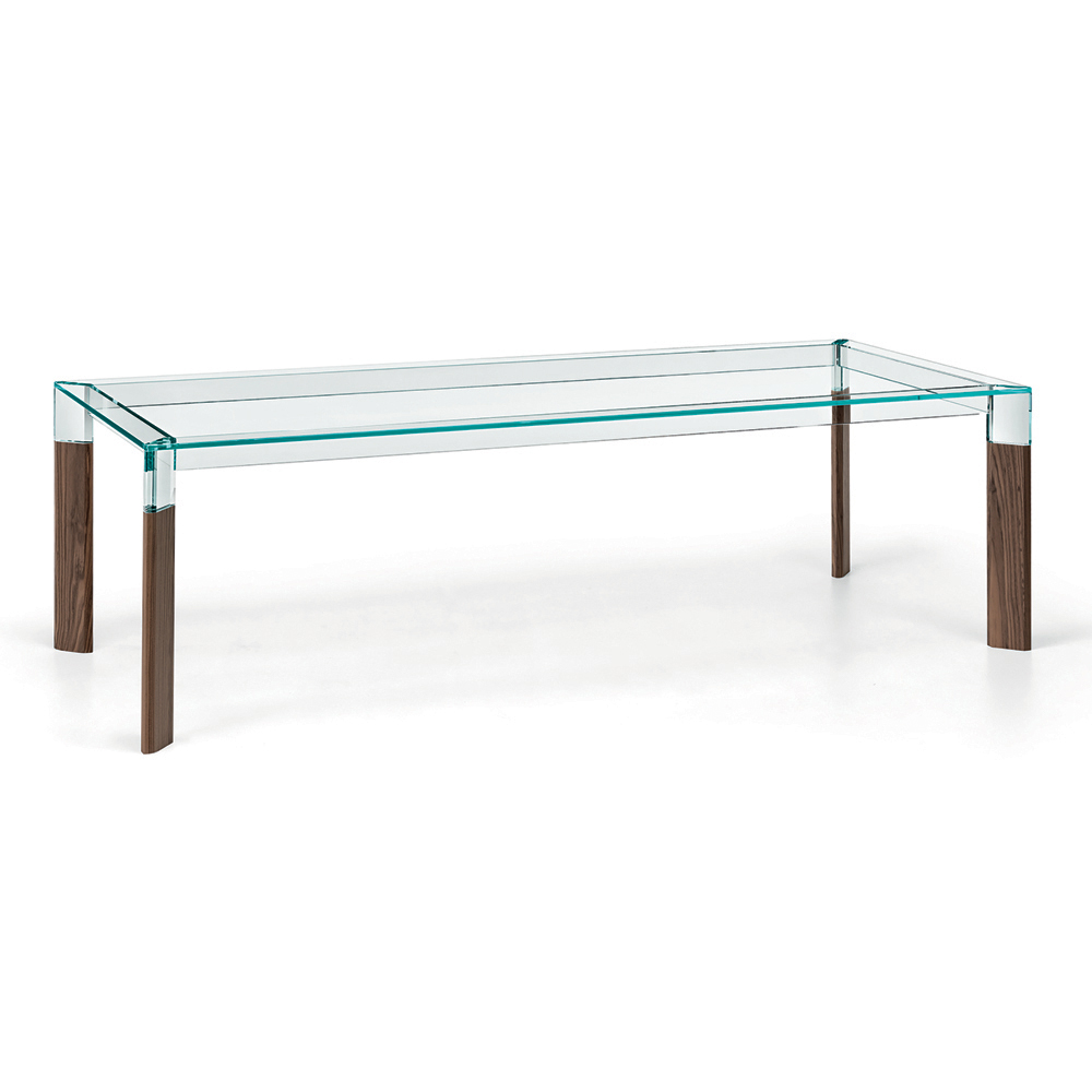 Kuchyňský stůl se skleněnou deskou a dřevěnými nohami Made in Italy.