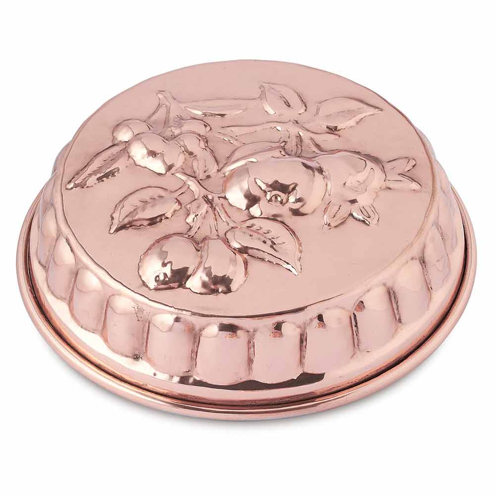 Kulatý pekáč s ovocným zdobením ručně vyrobený v Itálii pocínované mědi.