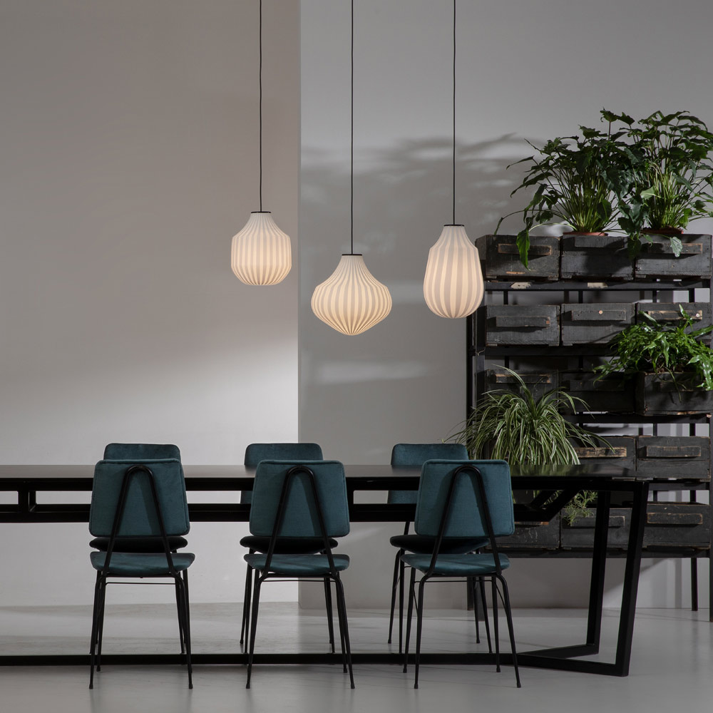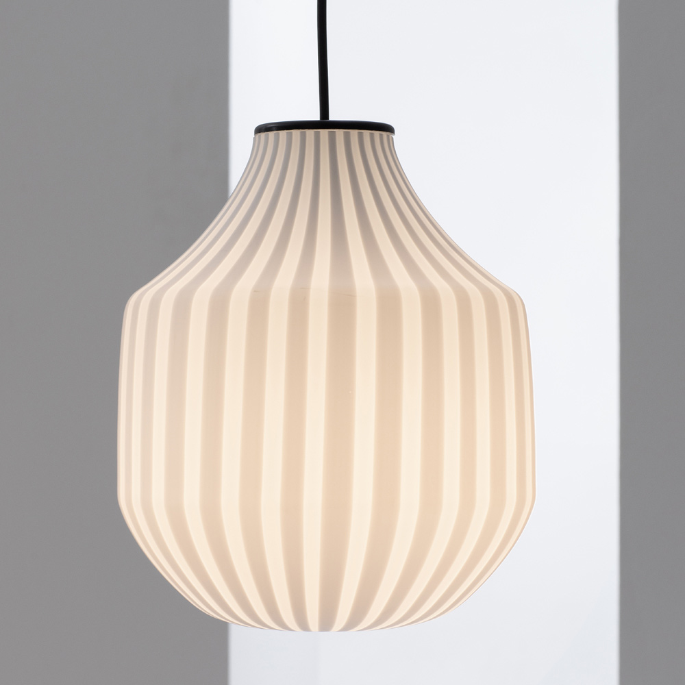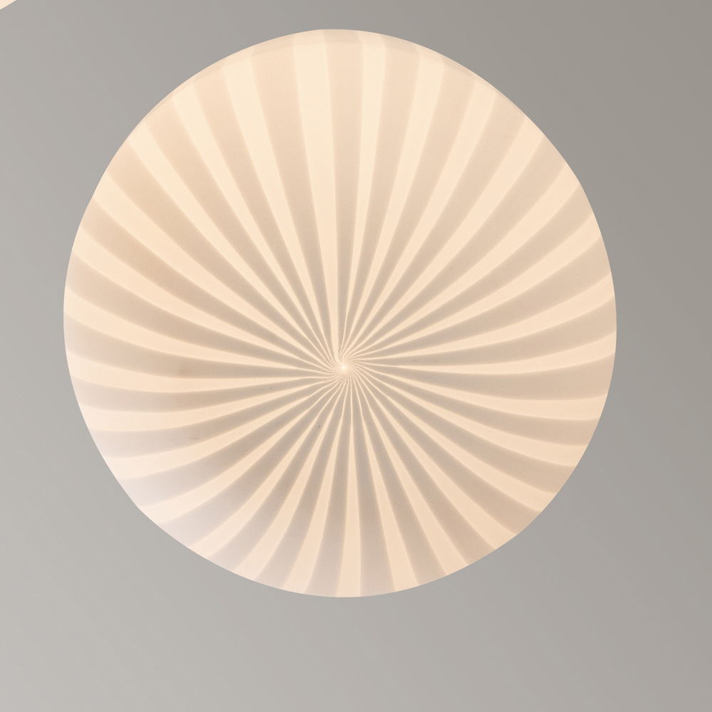 Lampa je vyrobena s bílým filigránovým skleněným difuzorem díky řemeslnému zpracování , což je materiál, který dodává světlu lesk a modernost, které jím prochází a vytváří vznešenou a poutavou atmosféru, a odnímatelnou hliníkovou základnou.