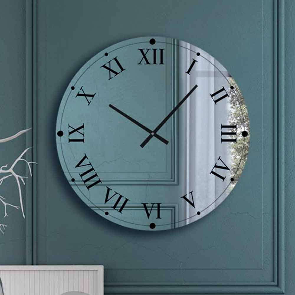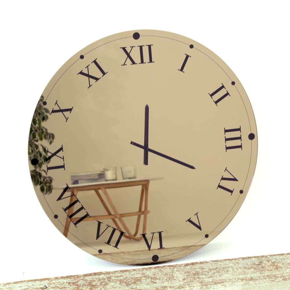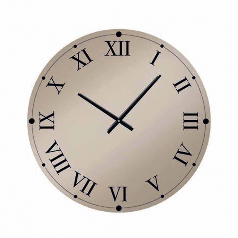 zrcadlového křišťálového skla s římskými číslicemi a černými ručičkami.