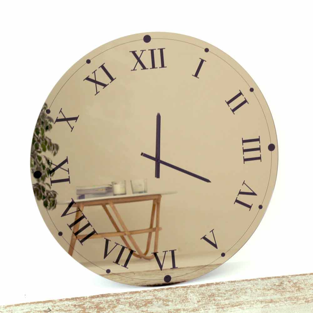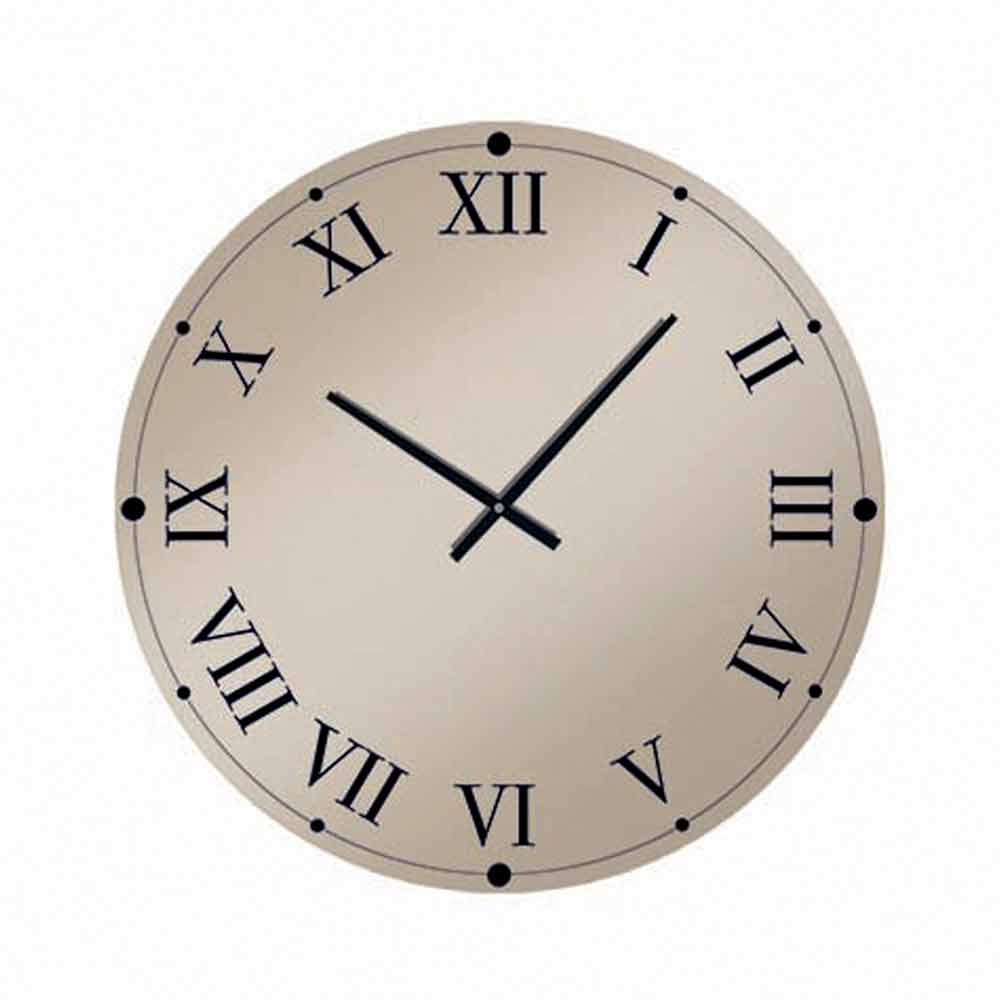 Kulaté nástěnné hodiny vyrobené v Itálii ze zrcadlového křišťálového skla s římskými číslicemi a černými ručičkami.