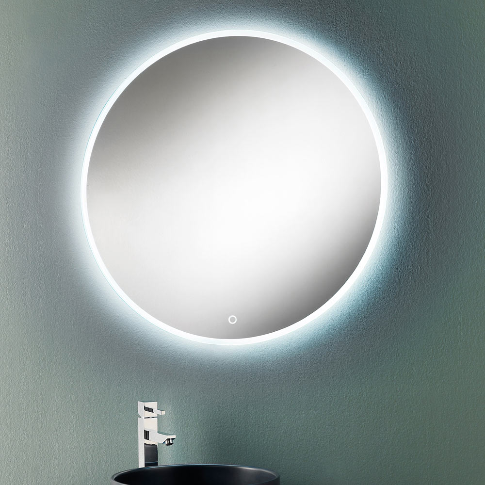 Kulaté nástěnné koupelnové zrcadlo moderního designu s pískovanou a podsvícenou hranou, vyrobeno v Itálii.