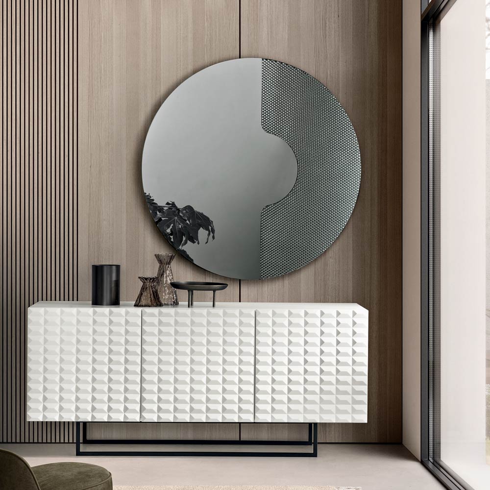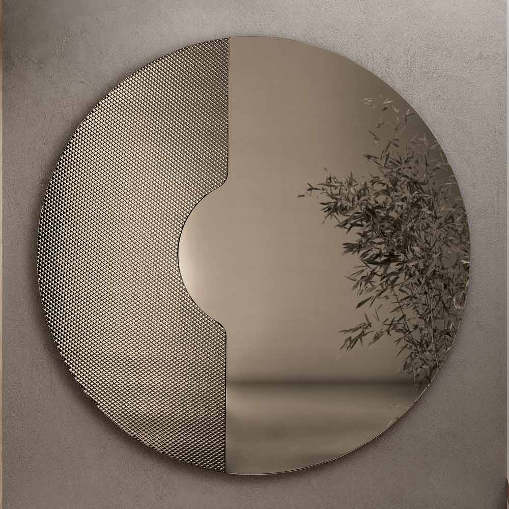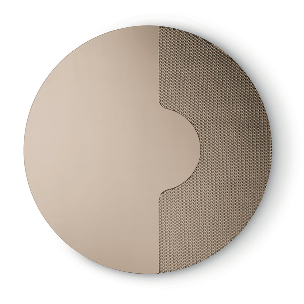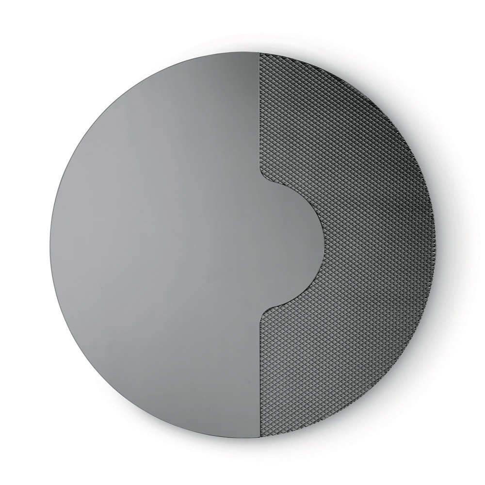 Kulaté zrcadlo má boční vložku ze skla tón v tónu s gravírovaným grafickým síťovaným vzorem . Tento dekorativní prvek drží zrcadlový panel, jako by na něm spočíval, a vytváří tak rafinovaný trojrozměrný efekt a elegantní souhru tlouštěk a odrazů.