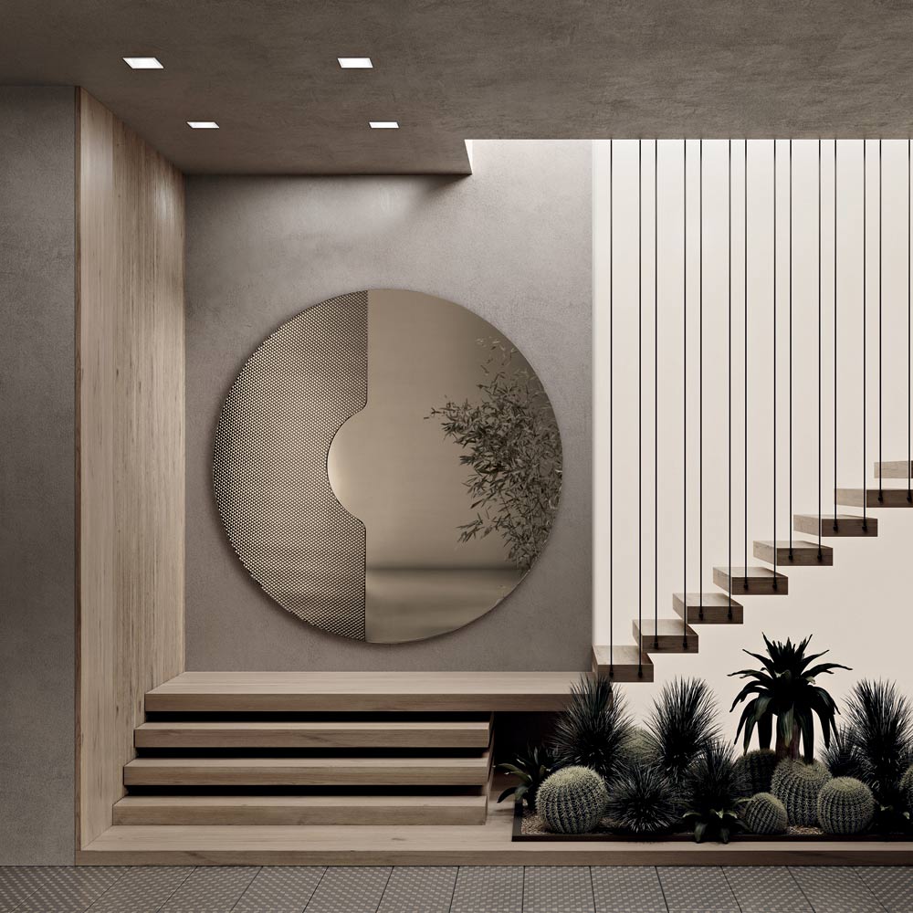 Díky rovnováze mezi geometrií a texturou se toto zrcadlo stává sofistikovaným dekorativním prvkem, který dokáže dodat stěně hloubku a jas a dokonale se přizpůsobí modernímu a současnému prostředí.