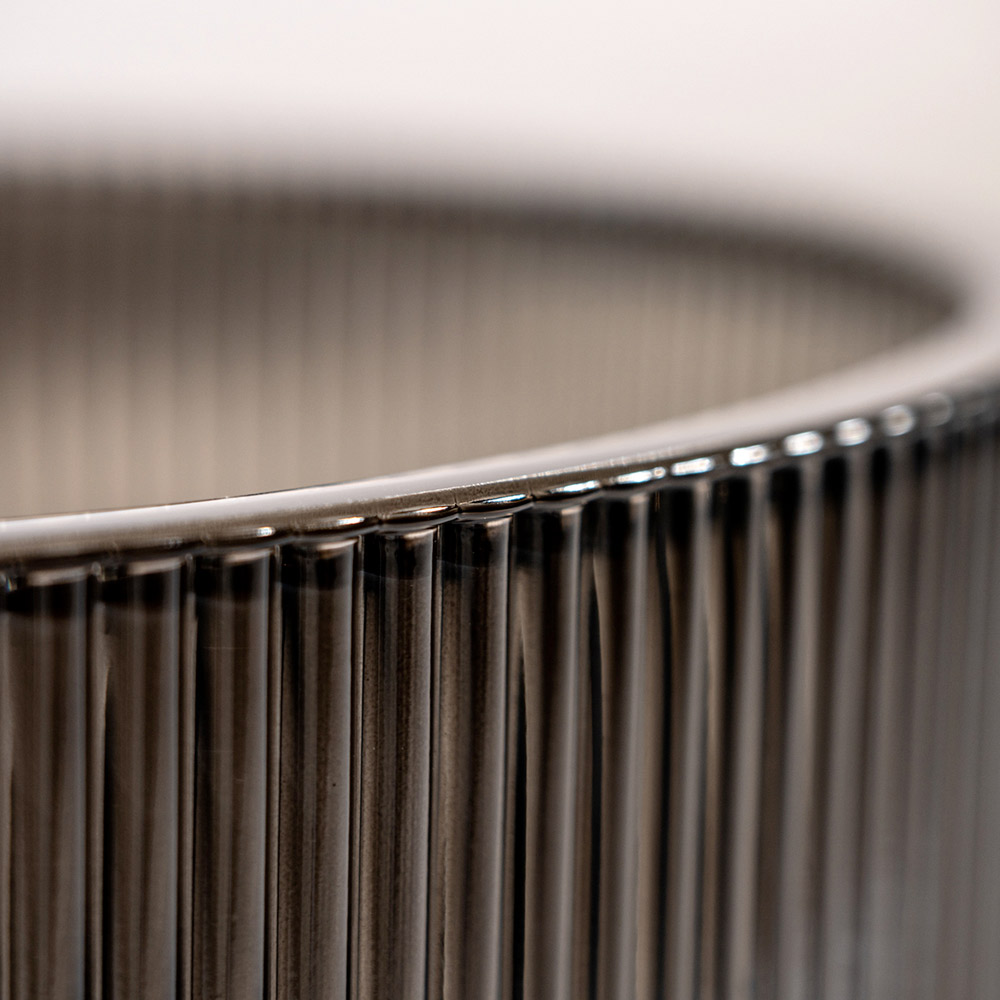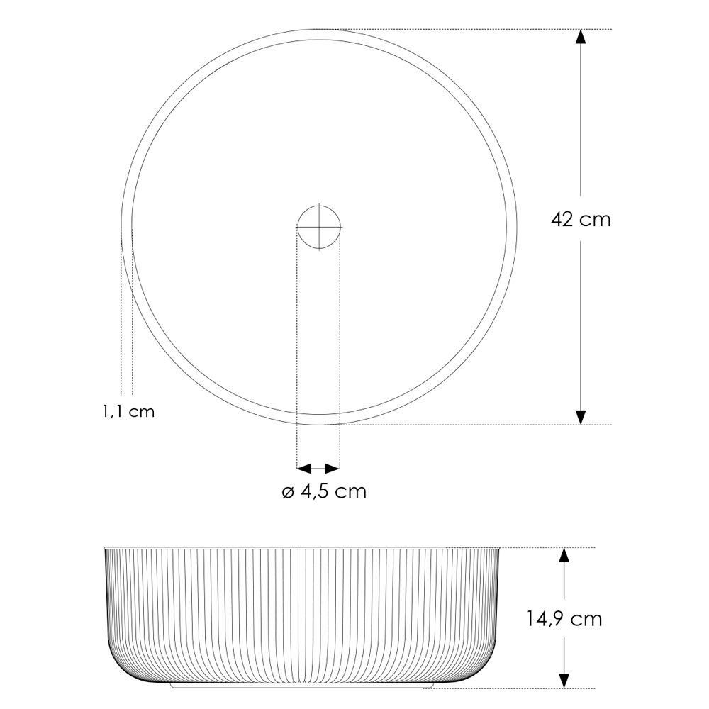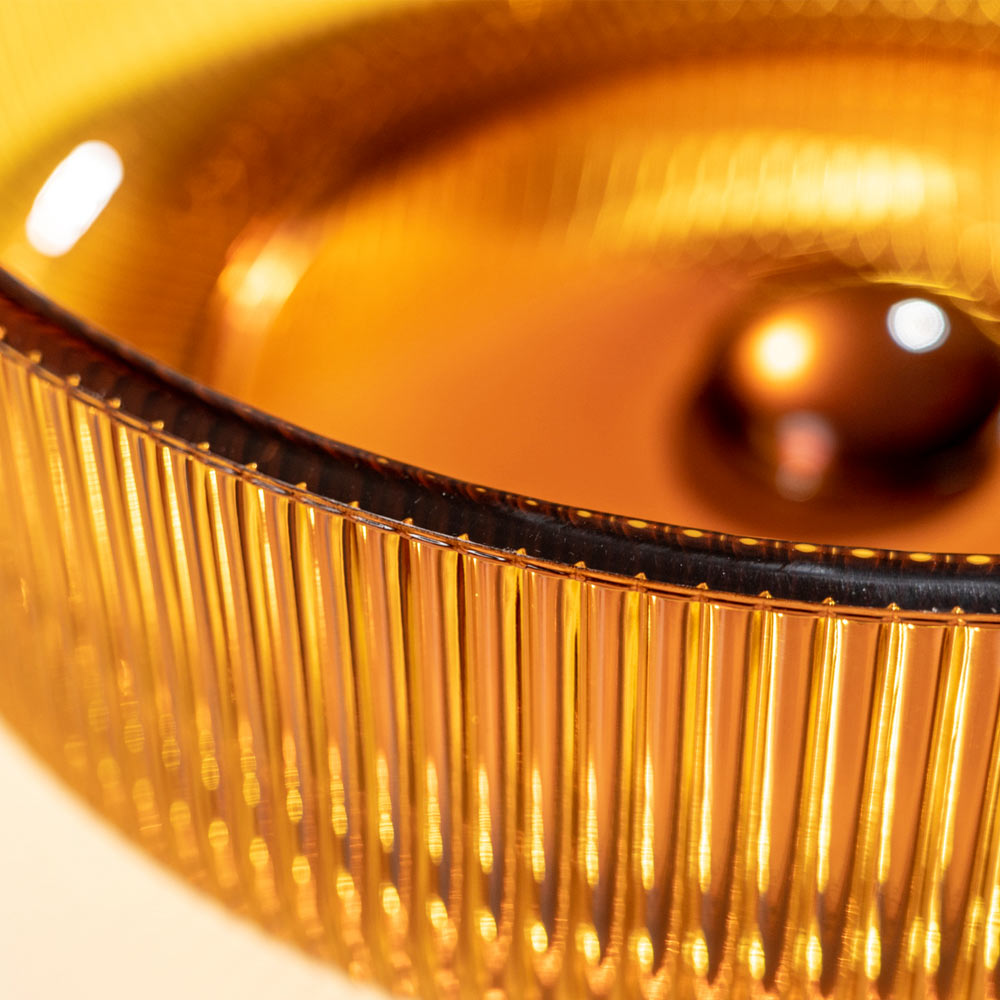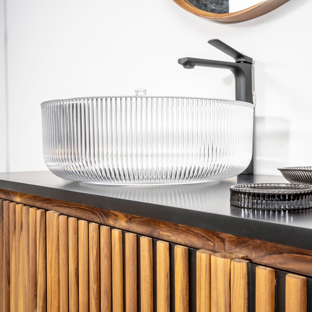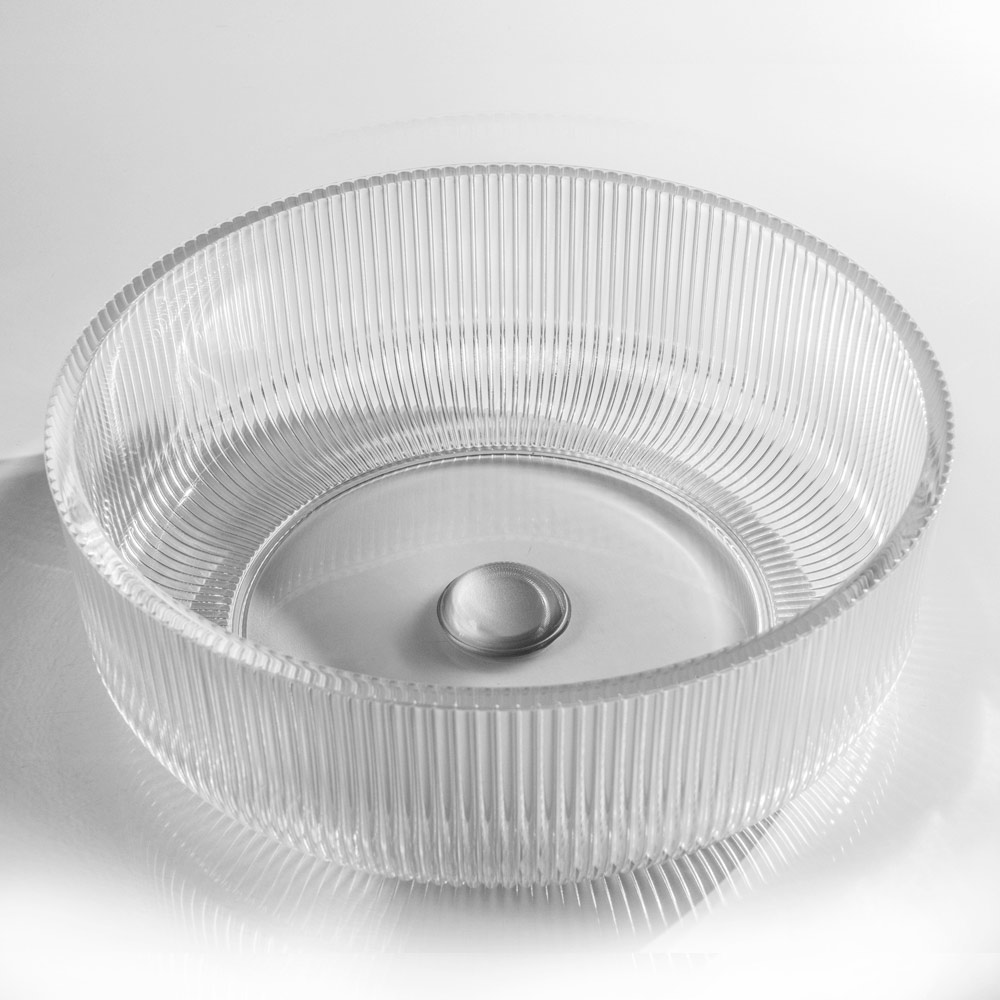 Dřezy jsou testovány speciálním přístrojem pro kontrolu nedokonalostí a/nebo zbytkového napětí ve skle. Mikrobubliny nebo mikronečistoty nelze považovat za vady, ale za důkaz řemeslného zpracování výrobku. Ručně vyráběné dekorované umyvadlo z foukaného skla.