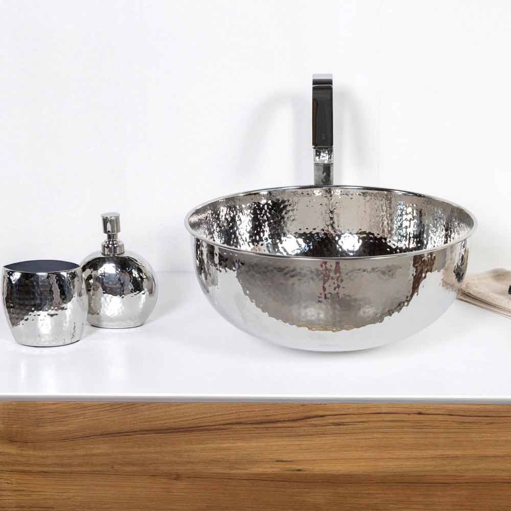 Moderní dřez z tepané chromované mosazi . Zvlněný horní okraj dodává umyvadlu větší pevnost a snadné čištění.