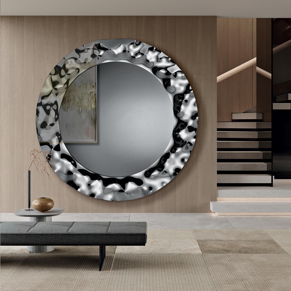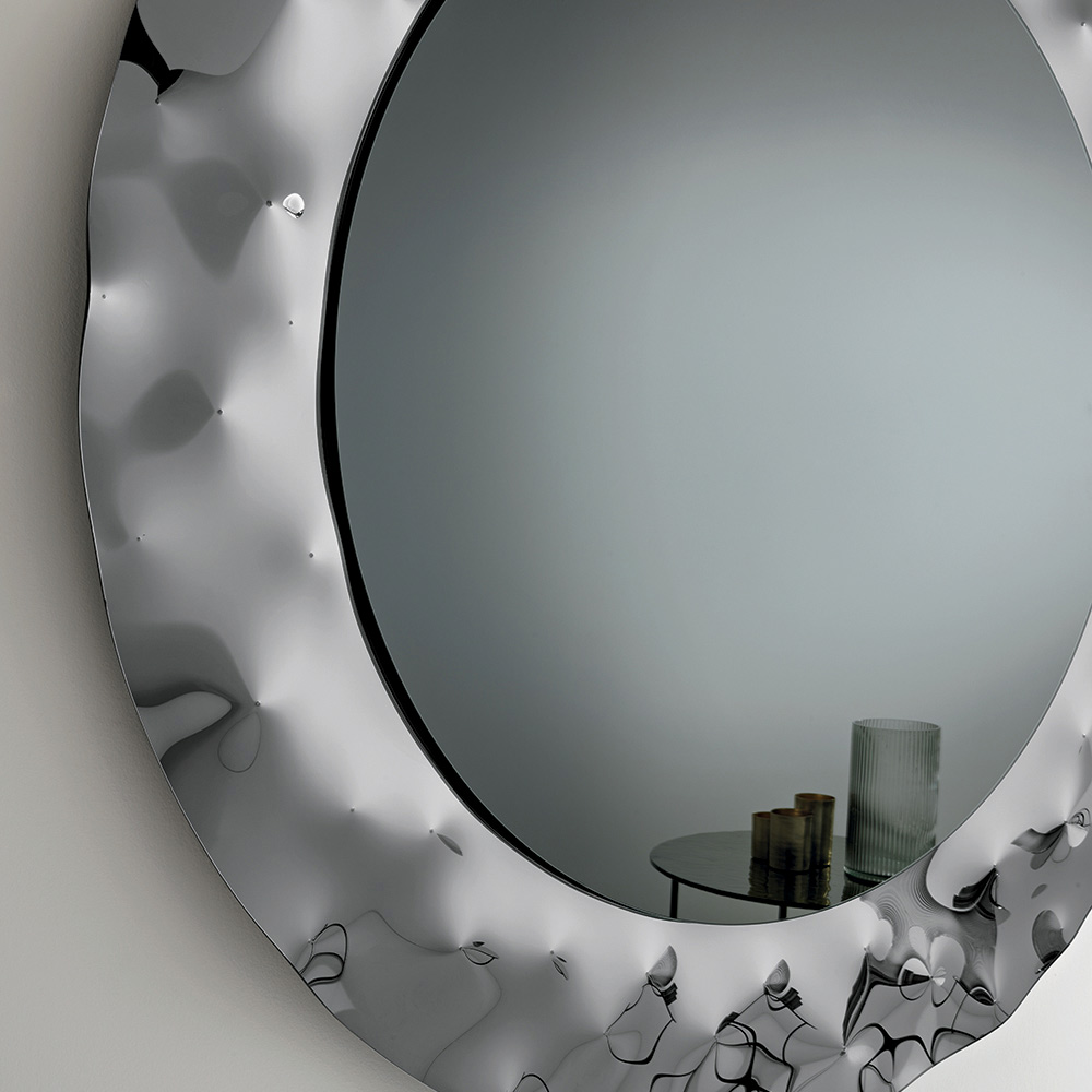 Reflexní povrch je zdoben zakřiveným skleněným rámem v odstínu tónu, který vede podél okraje zrcadla a vytváří elegantní souhru světla a textury. Unikátní skleněná povrchová úprava dodává kompozici hloubku a pohyb, čímž umocňuje moderní vzhled celého kusu.