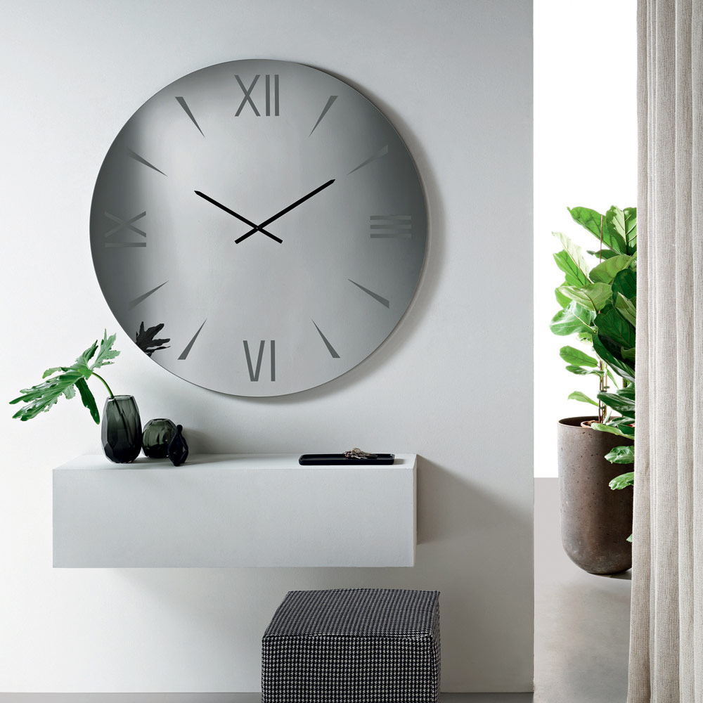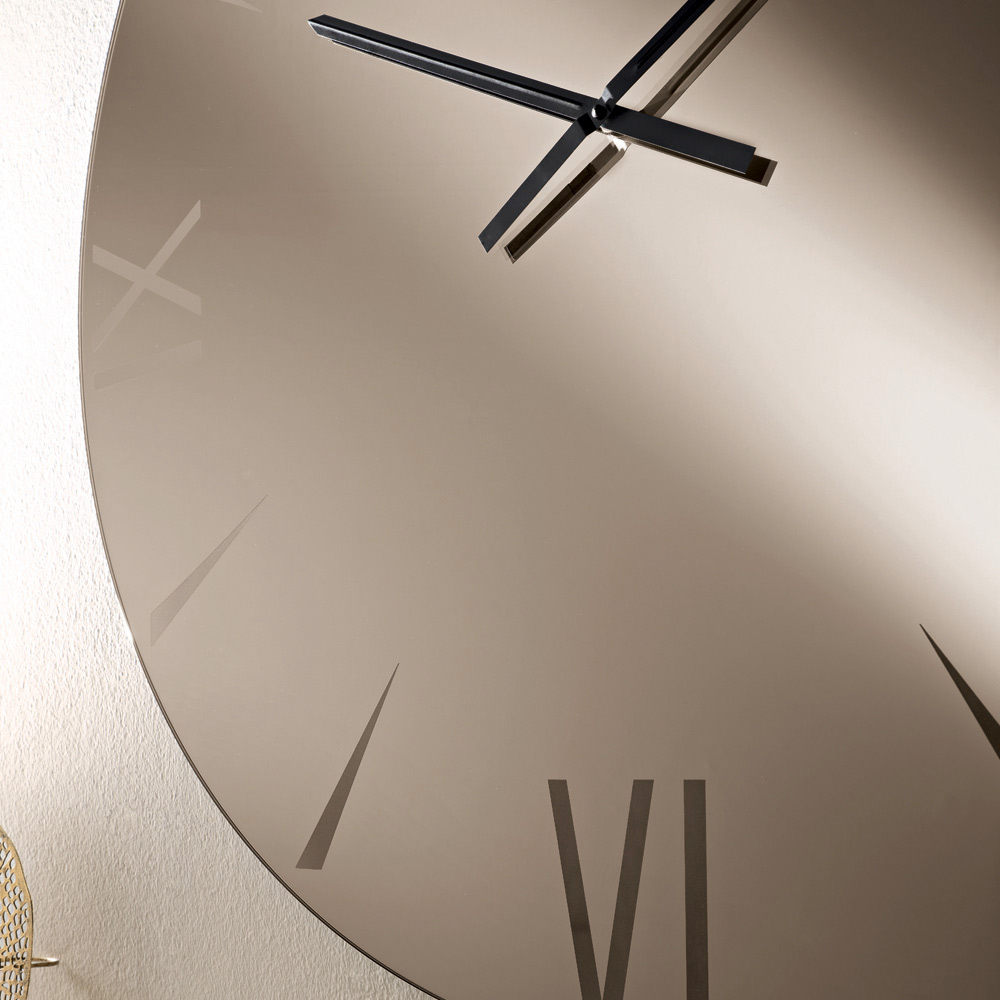 Hodiny vyrobené ze zrcadlového skla vynikají laserově gravírovanými číslicemi , interpretovanými s grafickou přesností a vizuální diskrétností. Reflexní povrch zachycuje světlo a zesiluje prostor, čímž vytváří rafinovanou souhru hloubky a odrazů.