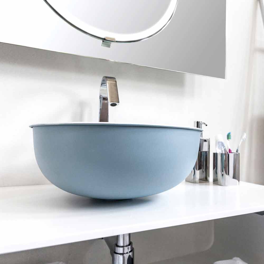 Moderní koupelnové umyvadlo na desku ze smaltovaného kovu.