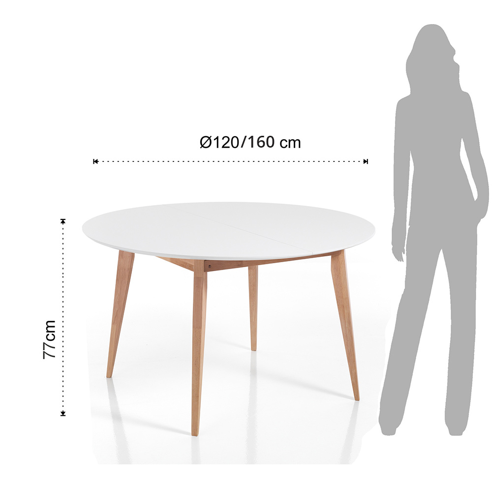 Jídelní stůl s kulatou rozkládací deskou z matného bílého lakovaného mdf (tloušťka 3 cm) a nohami z masivního dřeva s povrchovou úpravou bělený dub . Výrobek s jednoduchým a čistým designem, ideální pro ty, kteří milují zásadní a všestranný styl nábytku, který dokáže vkusně a osobitě dotvořit styl jejich jídelny nebo kuchyně. Jeho silnou stránkou je prodlužovací top, který díky prodloužení o 40 cm každý dosahuje délky 160 cm.