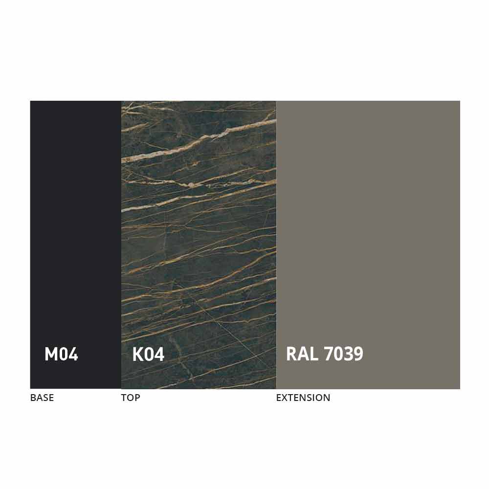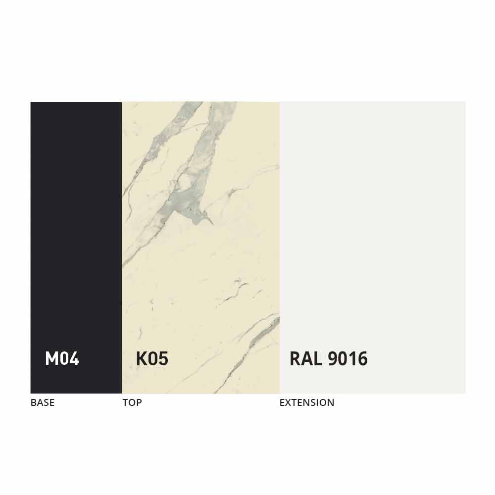 100% vyrobeno v Itálii , které zahrnuje použití keramiky jako vrchní desky a matně černého lakovaného kovu pro základnu.