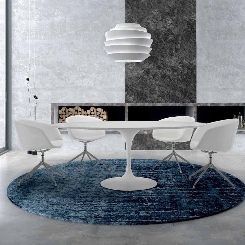 Moderní kulatý jídelní stůl s deskou z tekutého lamina a hliníkovou podnoží vyrobený v Itálii.