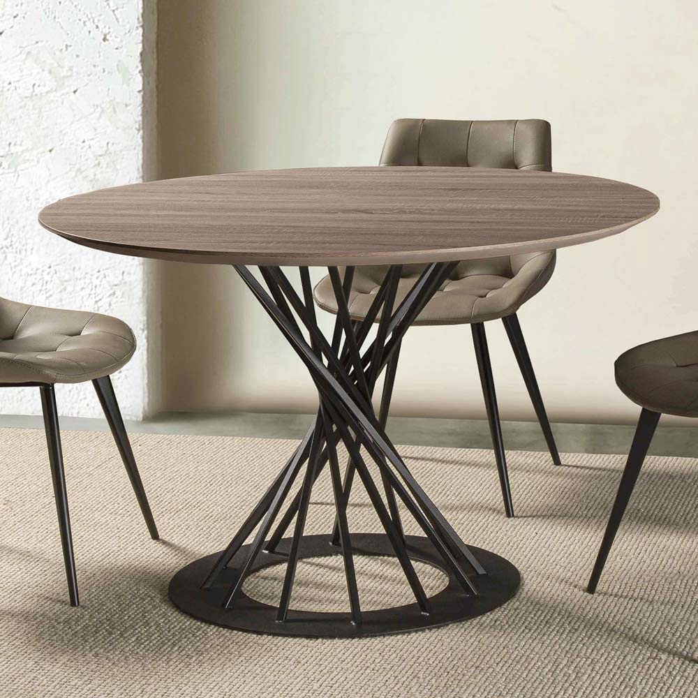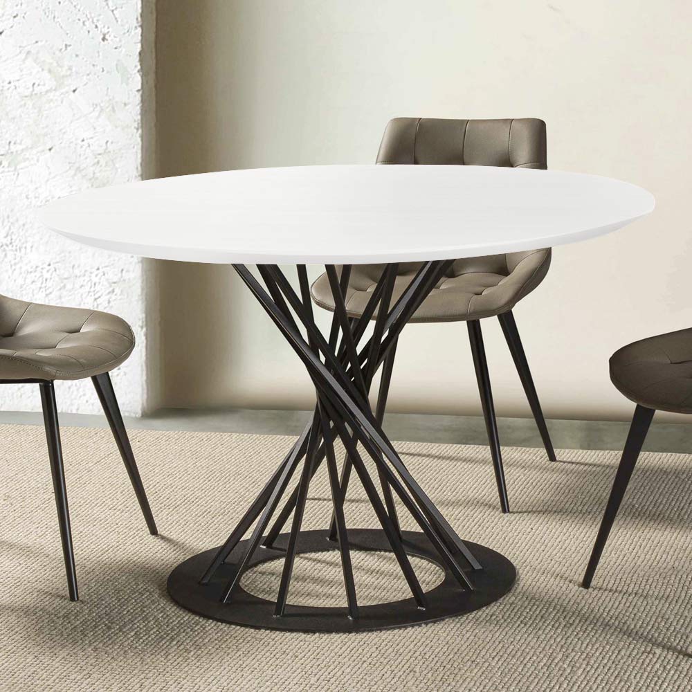 Kulatý jídelní stůl s laminovanou dřevěnou deskou a ocelovou základnou, průměr 120 cm.