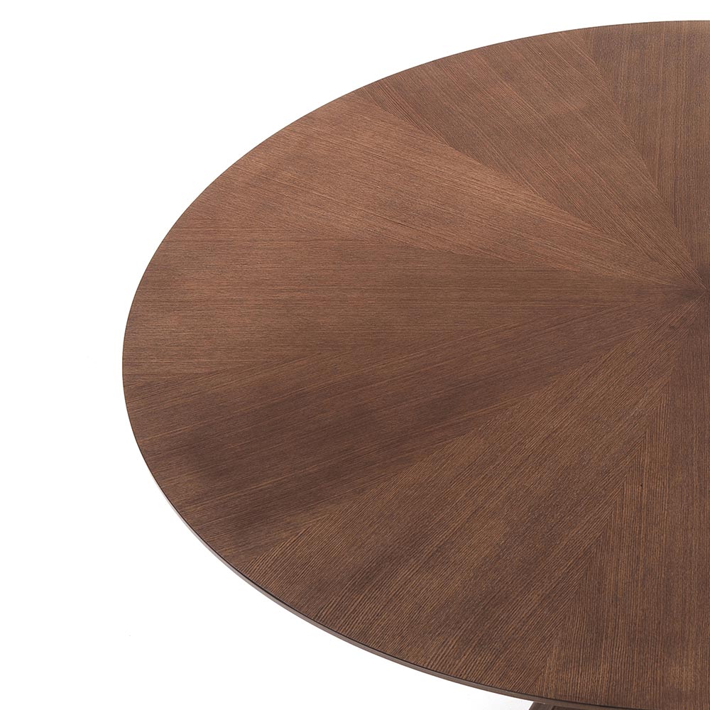 Jídelní stůl s kulatou MDF deskou a podnoží z masivního dřeva.