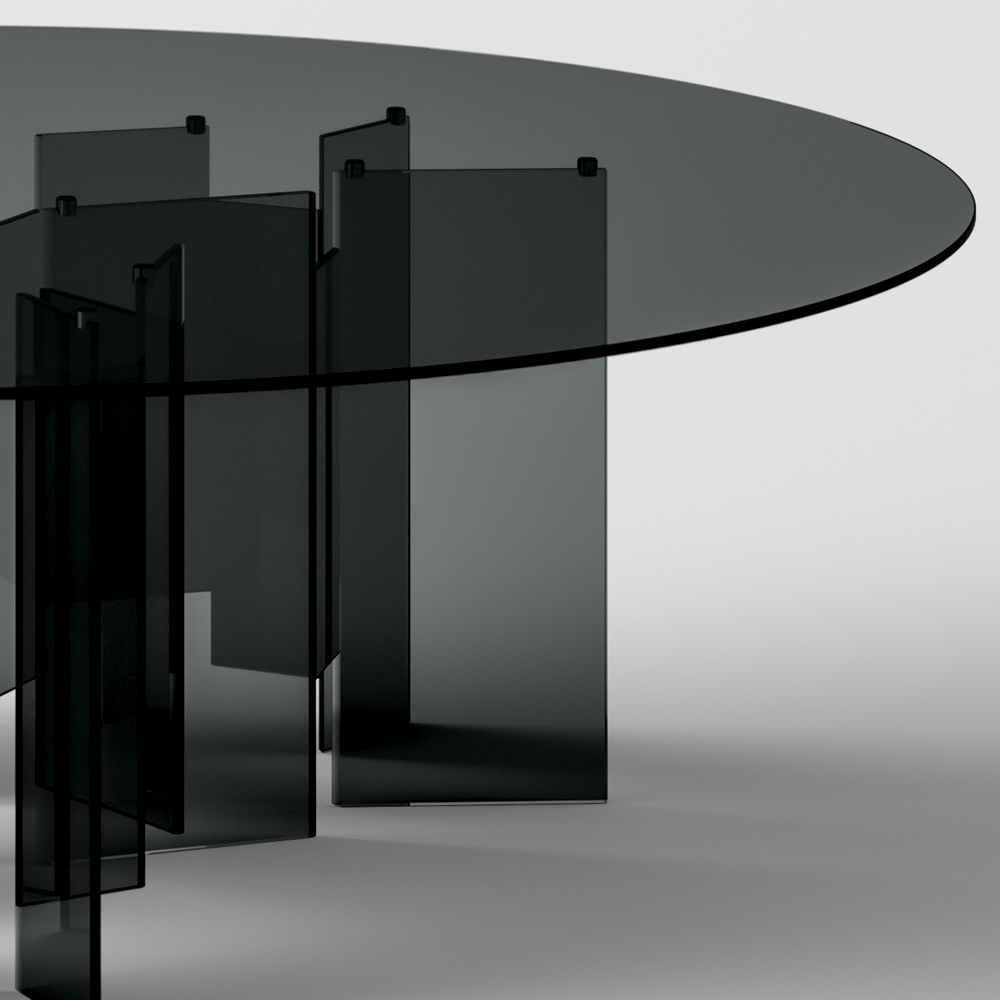 Jídelní stůl kompletně vyrobený ze skla s základ tvarů geometrický, který podporuje elegantní kulatý top . Řešení nábytku, které vychází z výrobního procesu Made in Italy prostřednictvím odborného zpracování skla zkušenými řemeslníky , kteří umožňují oživit dokonalou kombinaci kvality , designu a funkčnosti .