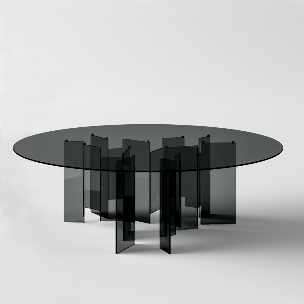 Volba použití jednoduchého materiálu , jako je sklo , ale zároveň se silným vizuálním dopadem charakterizuje celou estetiku výrobku , díky čemuž je originální , moderní a elegantní , ideální pro ty , kteří hledají řešení zařízení schopné dotvořit obývací prostor dům s moderní a impozantní osobností . Vizuálně pozoruhodný je nepochybně zvláštní tvar podnože, která je tvořena četnými skleněnými deskami spojenými asymetricky, aby stolu dodaly pocit dynamiky spolu s exkluzivním a rafinovaným nádechem .