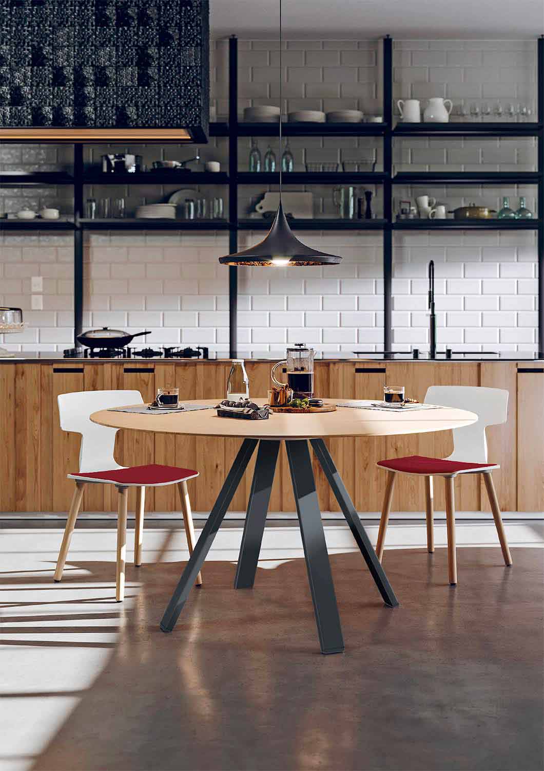 Tento jídelní stůl se vyznačuje bílou nebo černě namalovanou kovovou strukturou složenou ze 4 nohou uspořádaných do vzoru sunburst, které umožňují stabilitu a robustnost . Základna také umožňuje stolu získat eleganci a všestrannost, díky čemuž je snadno kombinovatelná s jakýmkoli nábytkem. Vrchní část je vyrobena z dubového MDF a je k dispozici ve dvou různých průměrech, aby se dokonale přizpůsobila každé potřebě.