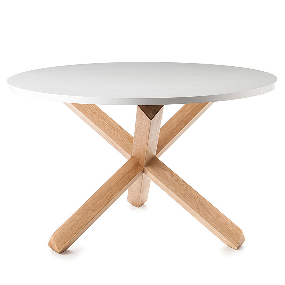 Kulatý jídelní stůl vyrobený z mdf a masivního dřeva.