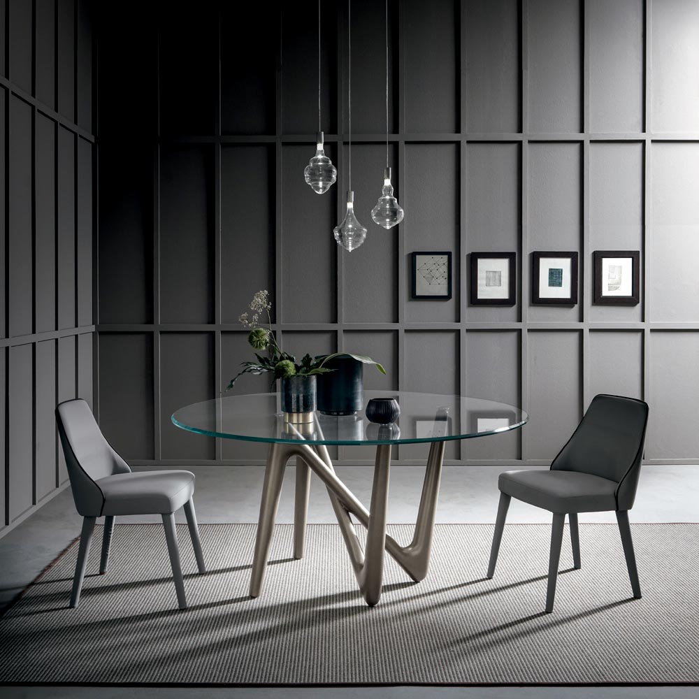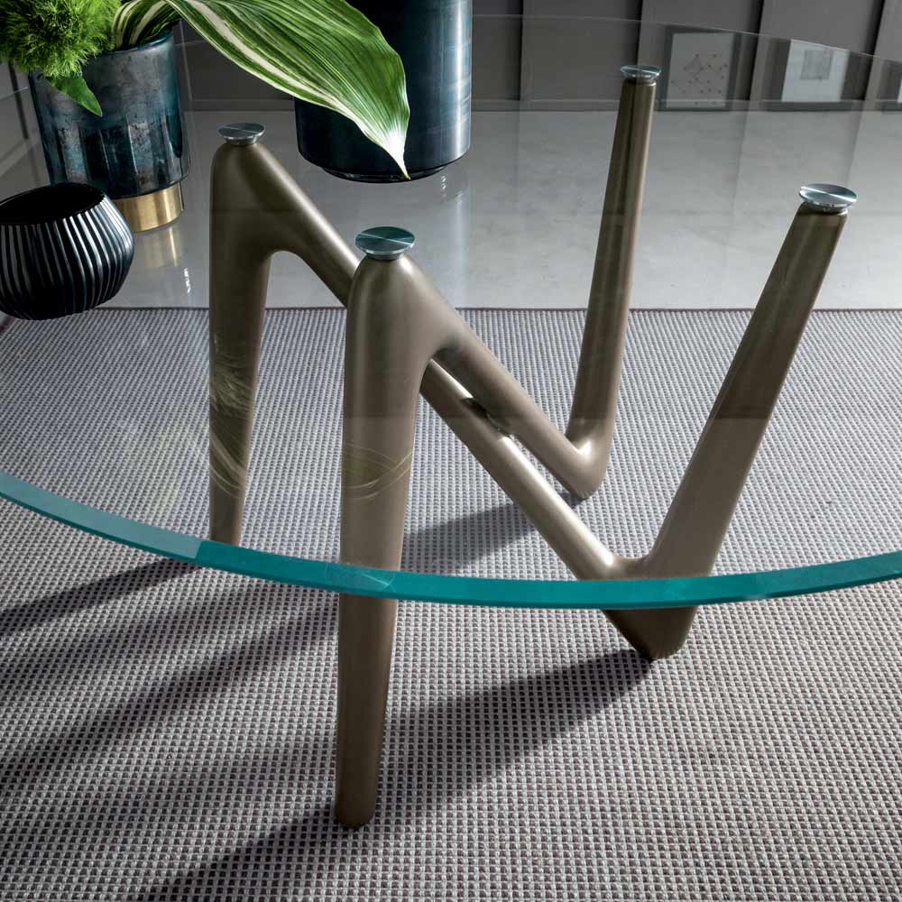 Tento kulatý jídelní stůl má konstrukci s nohami z tuhého polyuretanu lakovaného metalickým bronzem a vrchní desku ve tvaru sudu z extra čirého průhledného tvrzeného skla se zkosenými hranami.