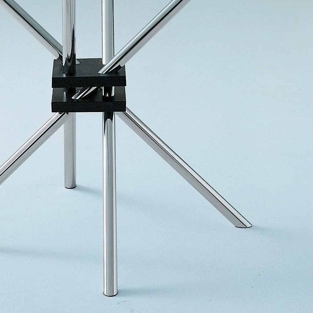 Jídelní stůl s kulatou deskou z tvrzeného skla (tloušťka 12 mm), podnož z chromované oceli a spojem z černě lakovaného litého hliníku. Jednoduchost a design jsou zvláštními vlastnostmi tohoto moderního nábytkového doplňku vyrobeného výhradně v Itálii, koncipovaného a navrženého tak, aby dobyl centrum každé jídelny nebo kuchyně současným stylem díky své všestranné osobnosti a extrémní nezbytnosti . Skleněná deska dodává výrobku eleganci a charakter, zatímco ocelová základna zajišťuje pevný a trvanlivý výrobek díky použití kvalitních materiálů . Výsledkem je střízlivý a elegantní jídelní stůl, který dokáže exkluzivním a vytříbeným nádechem charakterizovat jakoukoli stylistickou situaci.