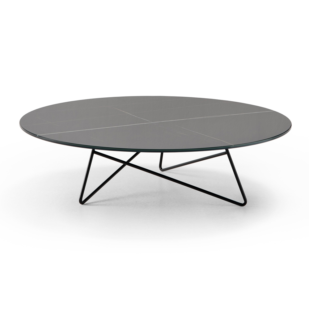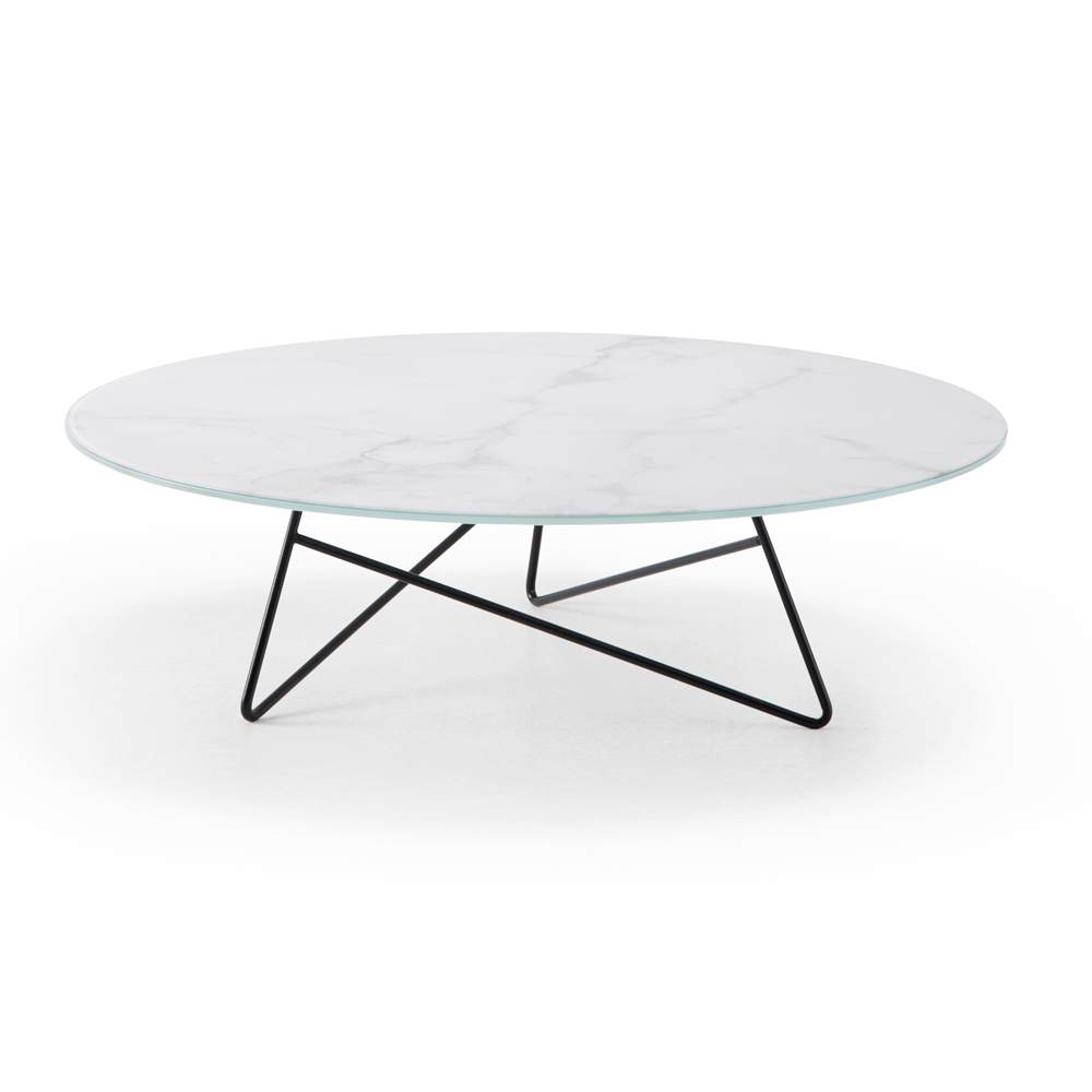 Nízký konferenční stolek s kulatou skleněnou mramorovou deskou, luxusní zboží vyrobené v Itálii.