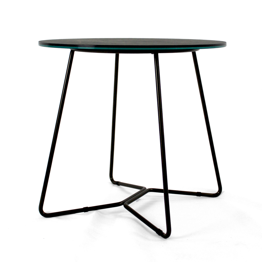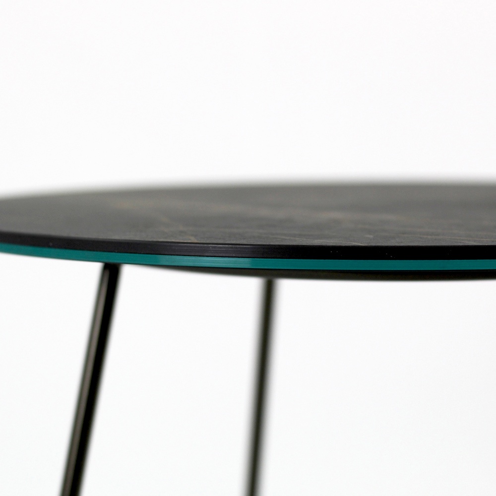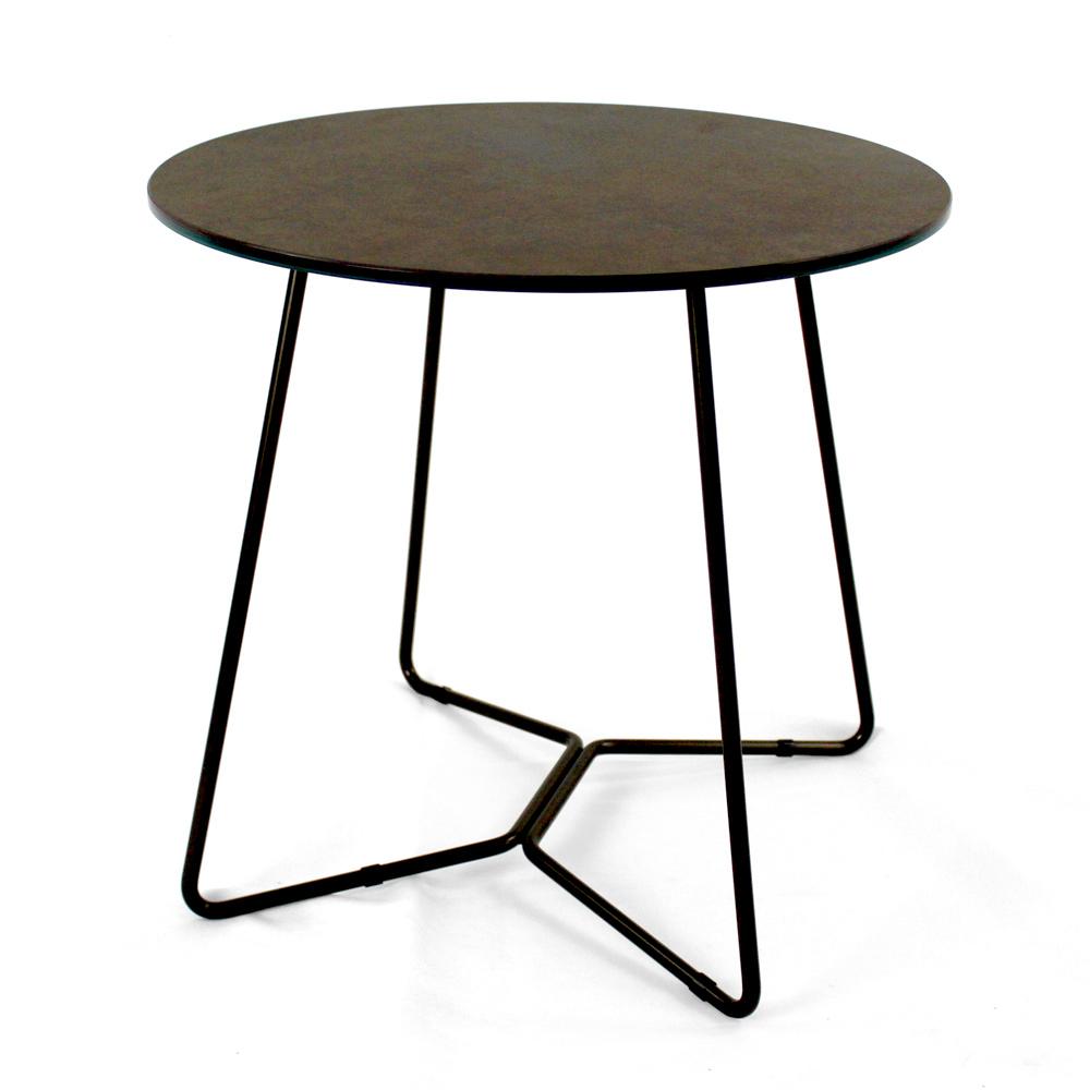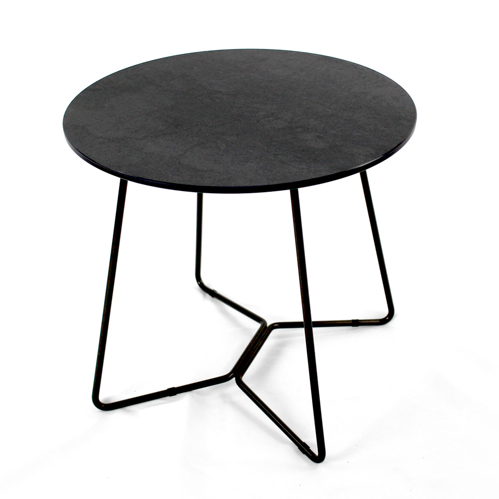 Kulatý konferenční stolek s lakovanou ocelovou základnou a horní deska z porcelánové kameniny.