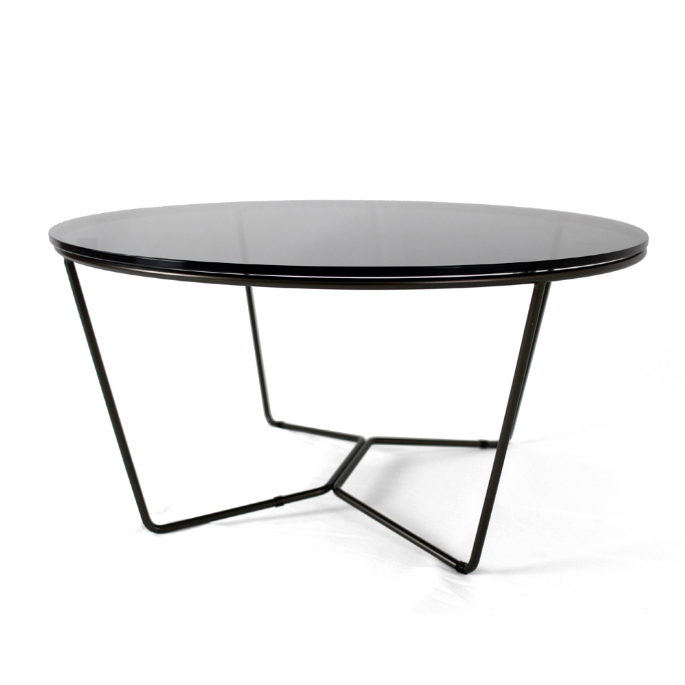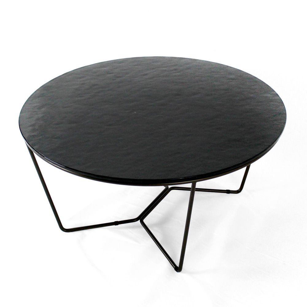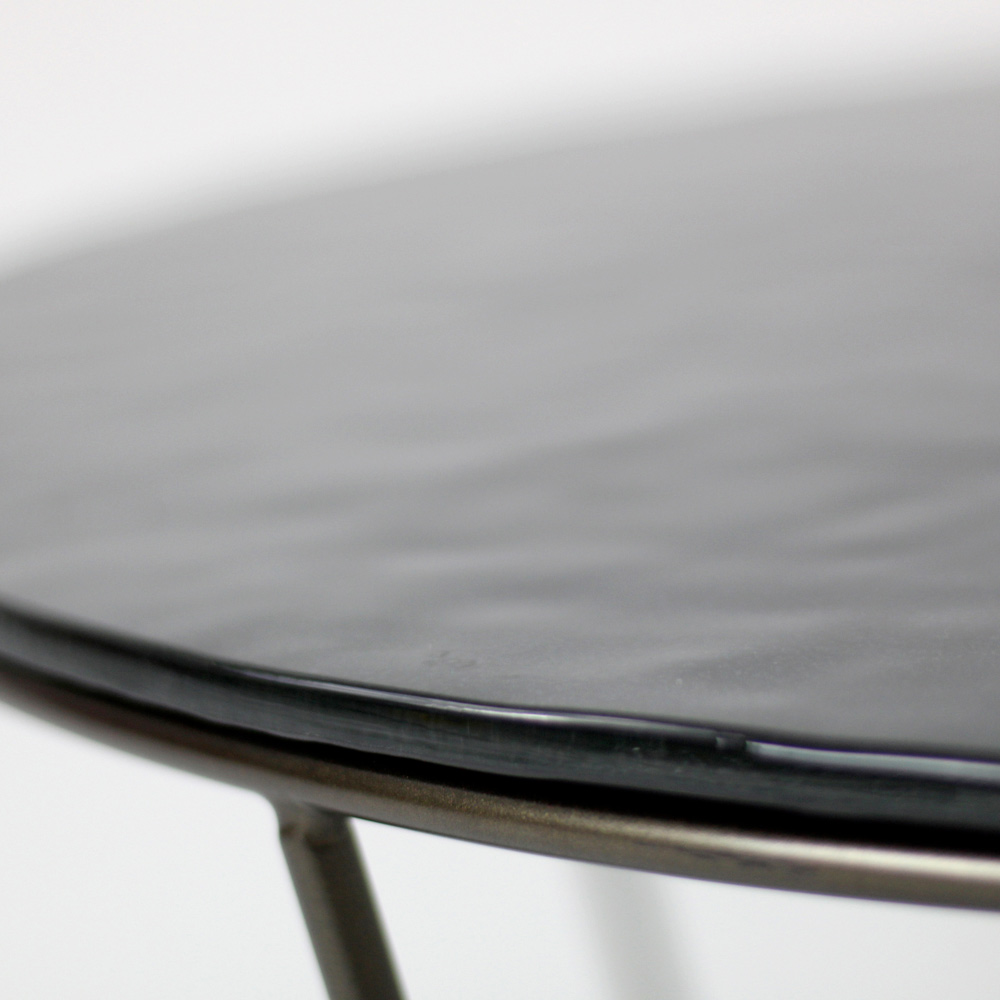 Kulatý konferenční stolek s lakovanou ocelovou základnou a skleněná deska.