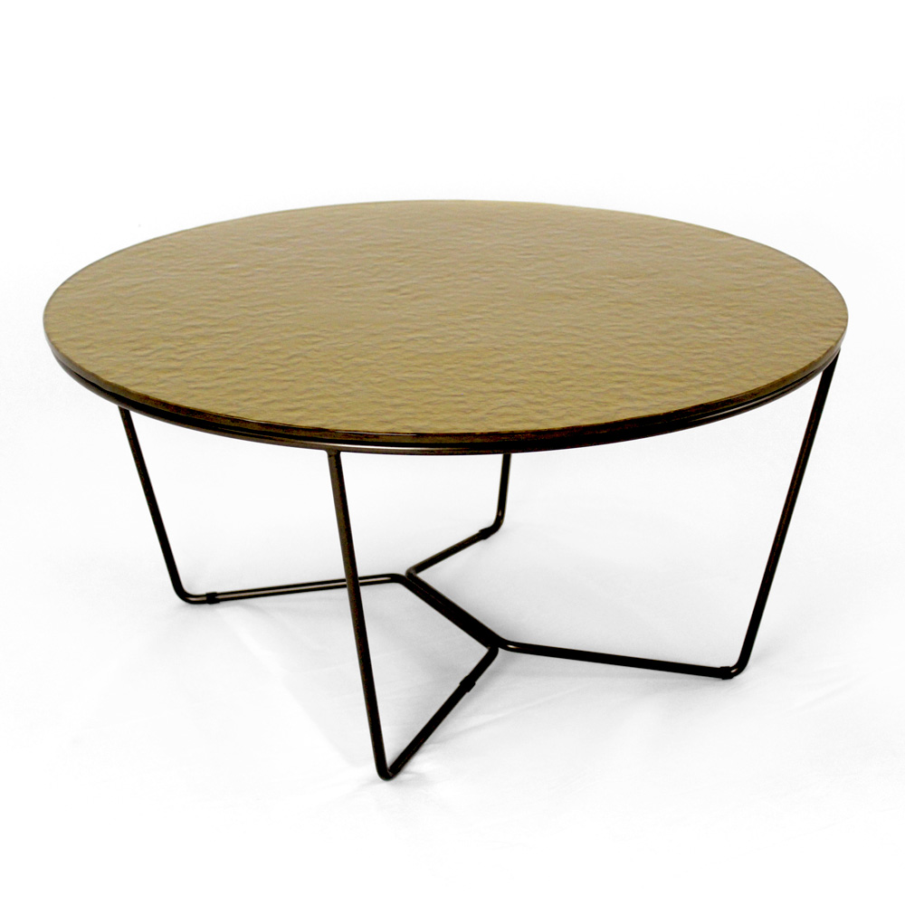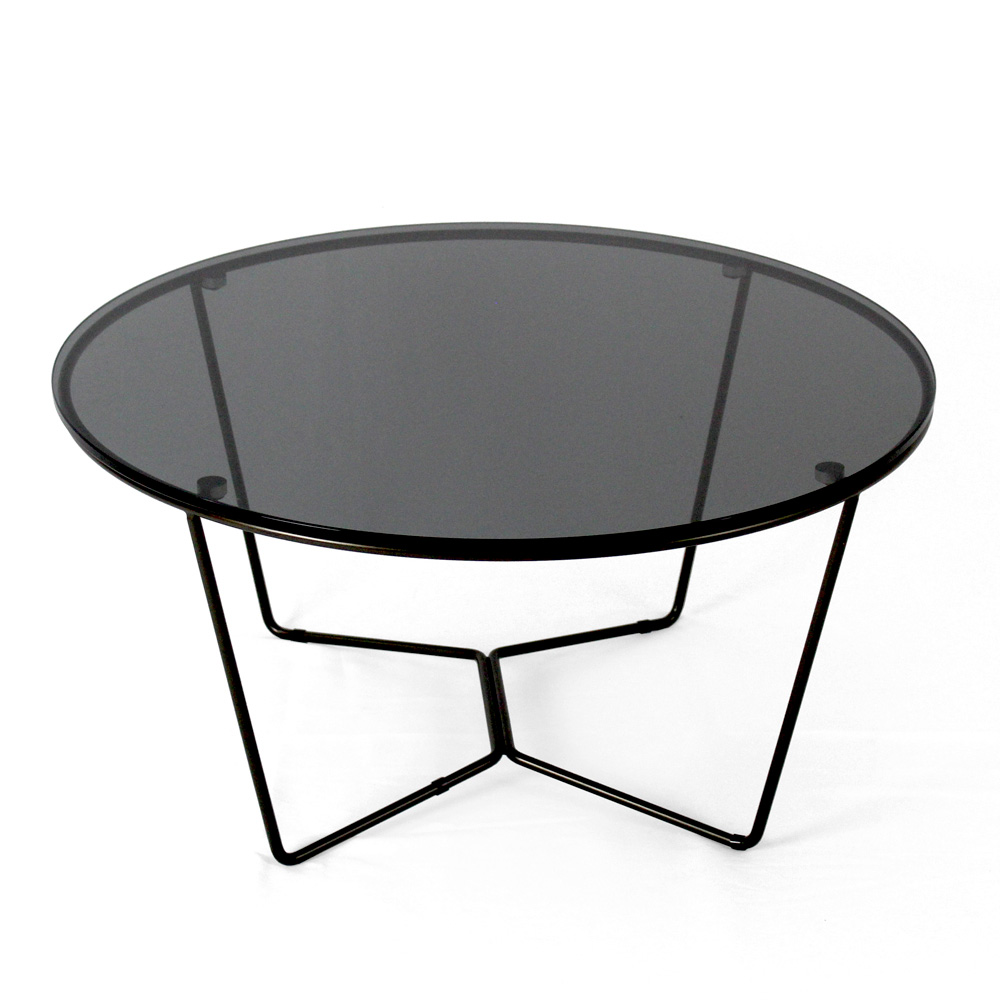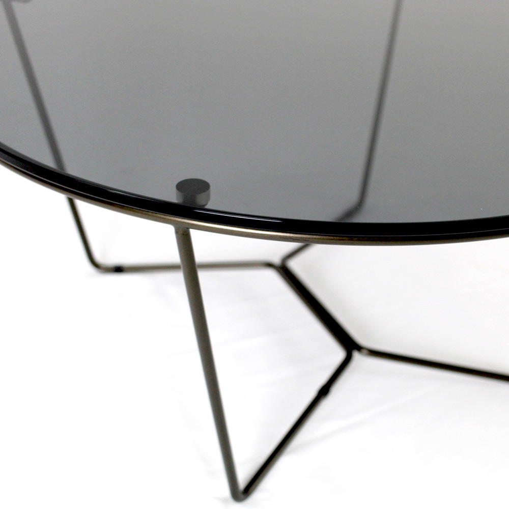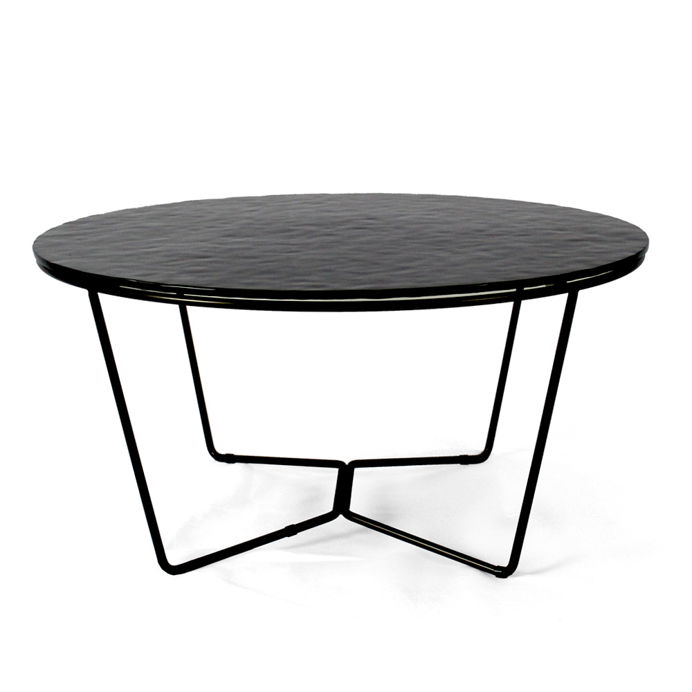 Kulatý konferenční stolek s lakovanou ocelovou základnou a skleněná deska.