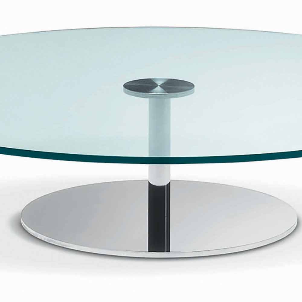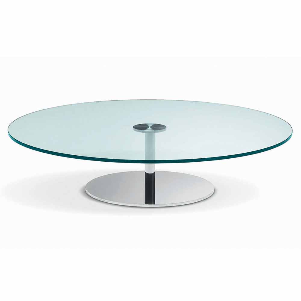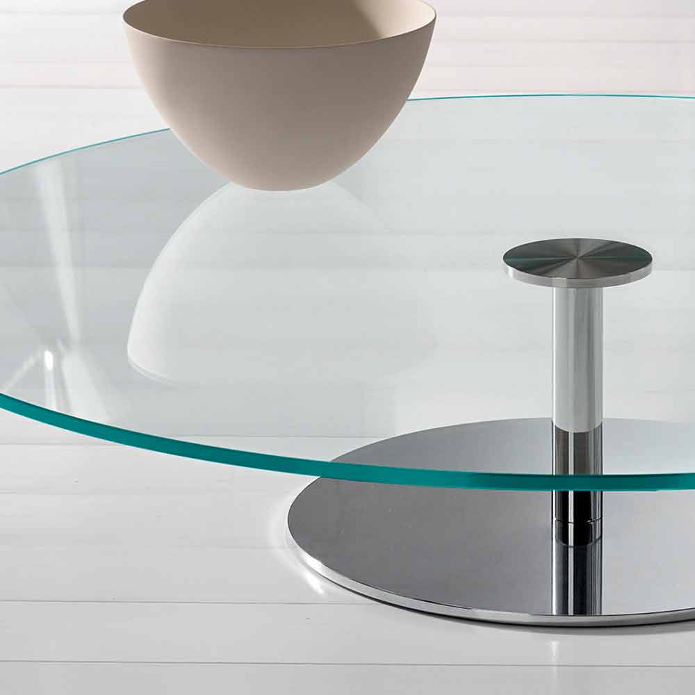 Tento nízký konferenční stolek do obývacího pokoje s kulatým designem se vyznačuje deskou zcela vyrobenou z extra čirého skla a kovovou podpěrnou základnou v chromované povrchové úpravě, která vytváří nádherné světelné a trojrozměrné efekty.