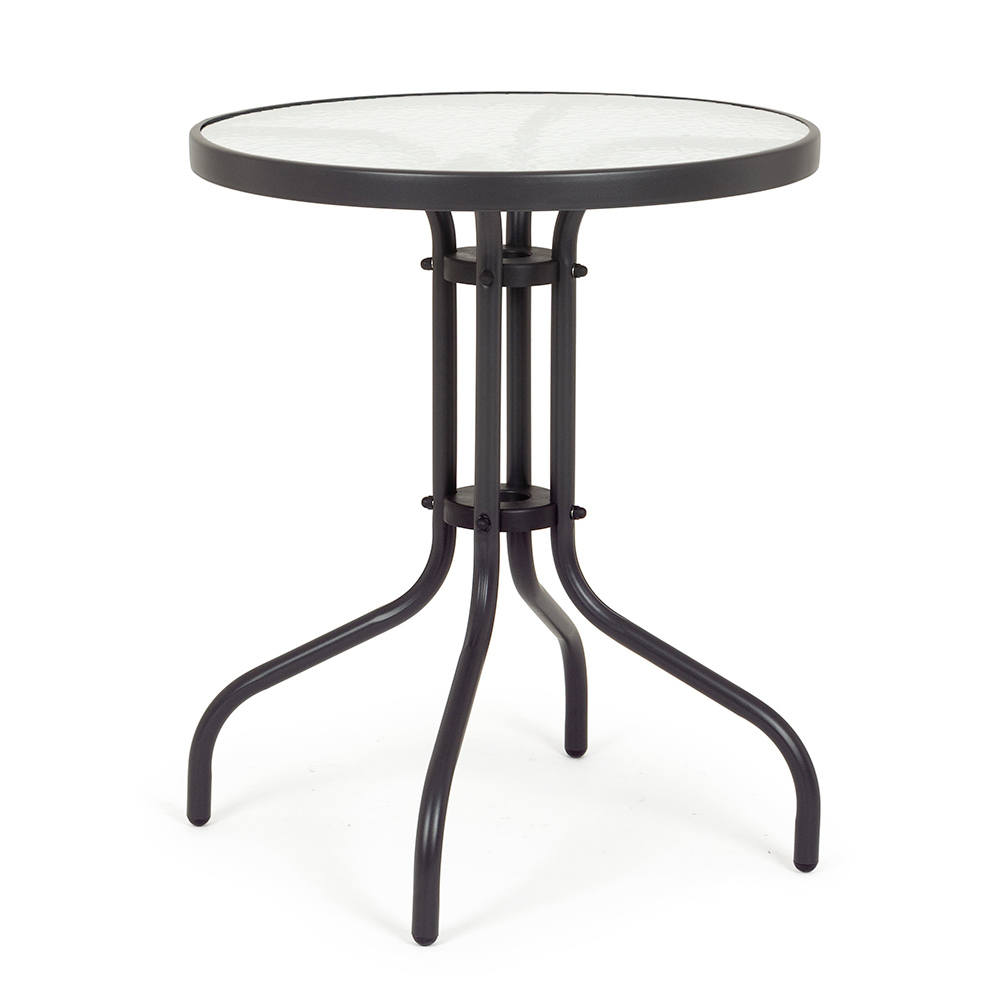 Kulatý ocelový venkovní stůl se skleněnou střechou, zahradní předměty.