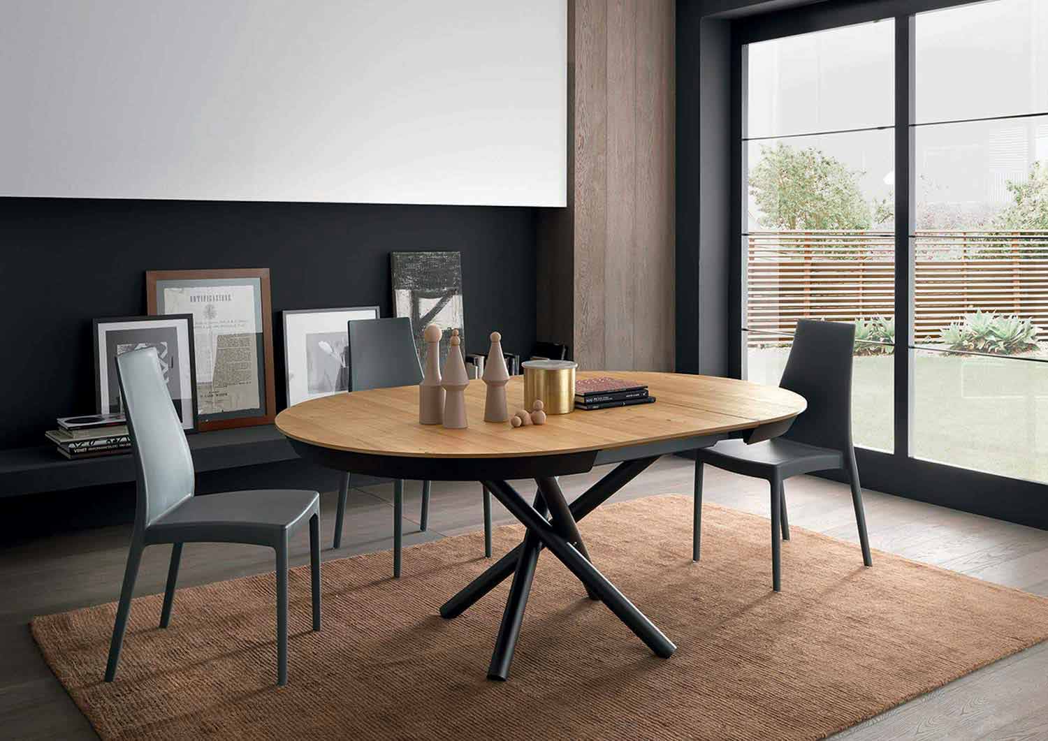 Kulatý rozkládací jídelní stůl s dřevěnou deskou a kovovou podnoží Made in Italy.