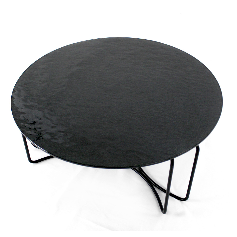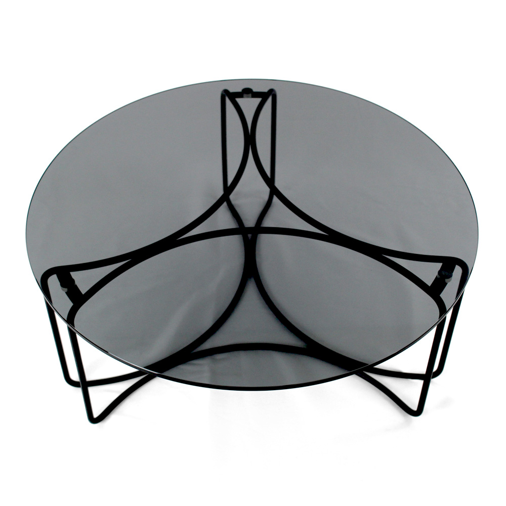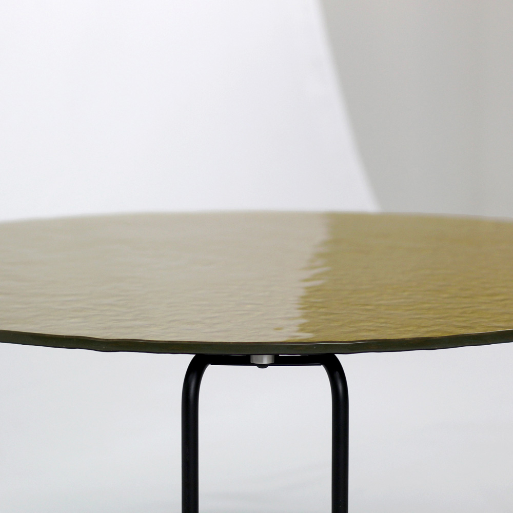 Kulatý konferenční stolek s lakovanou ocelovou základnou a skleněná deska.