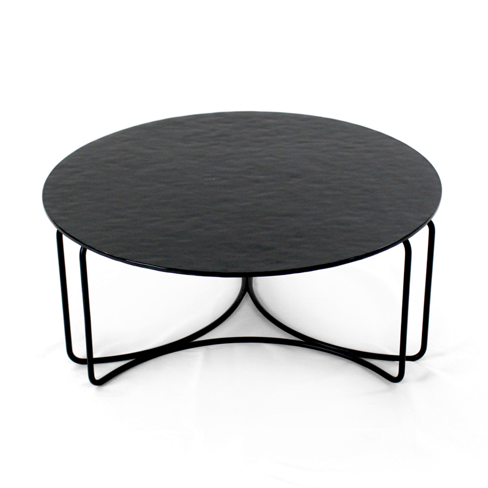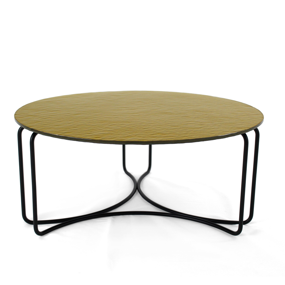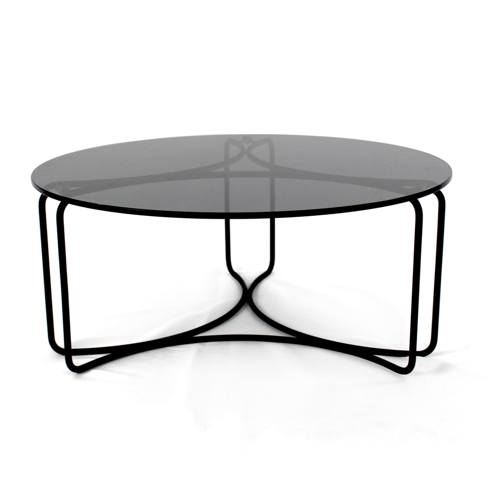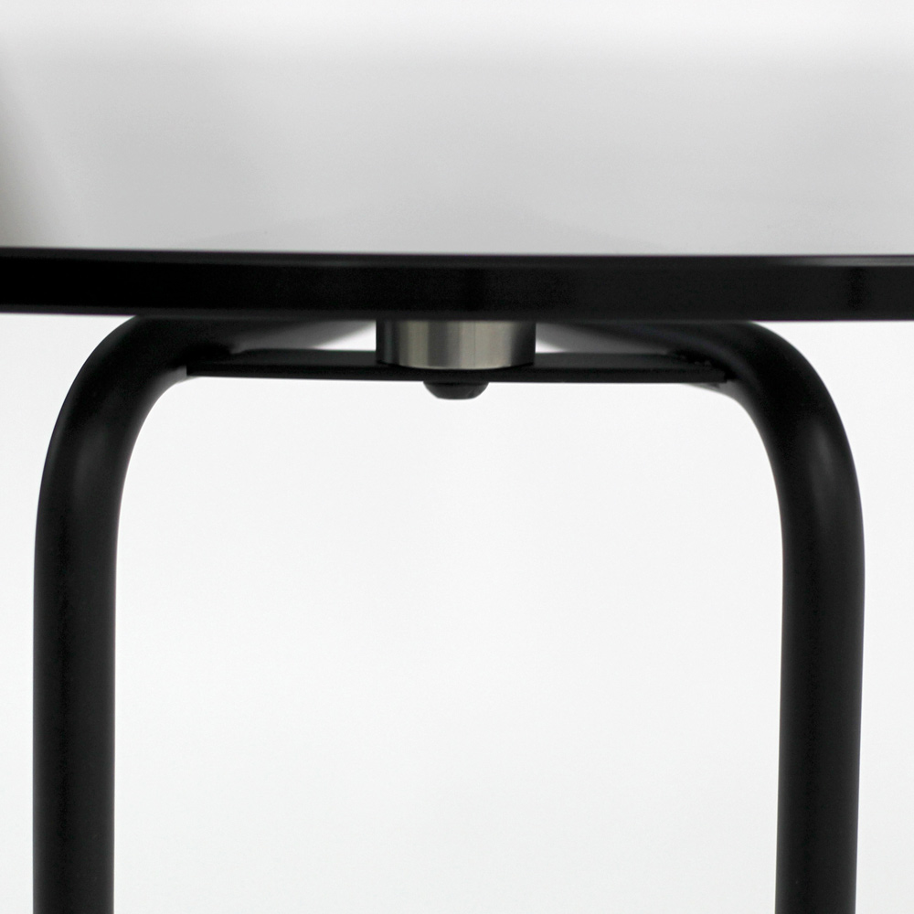 Kulatý konferenční stolek s lakovanou ocelovou základnou a skleněná deska.