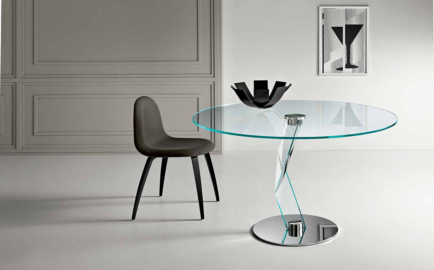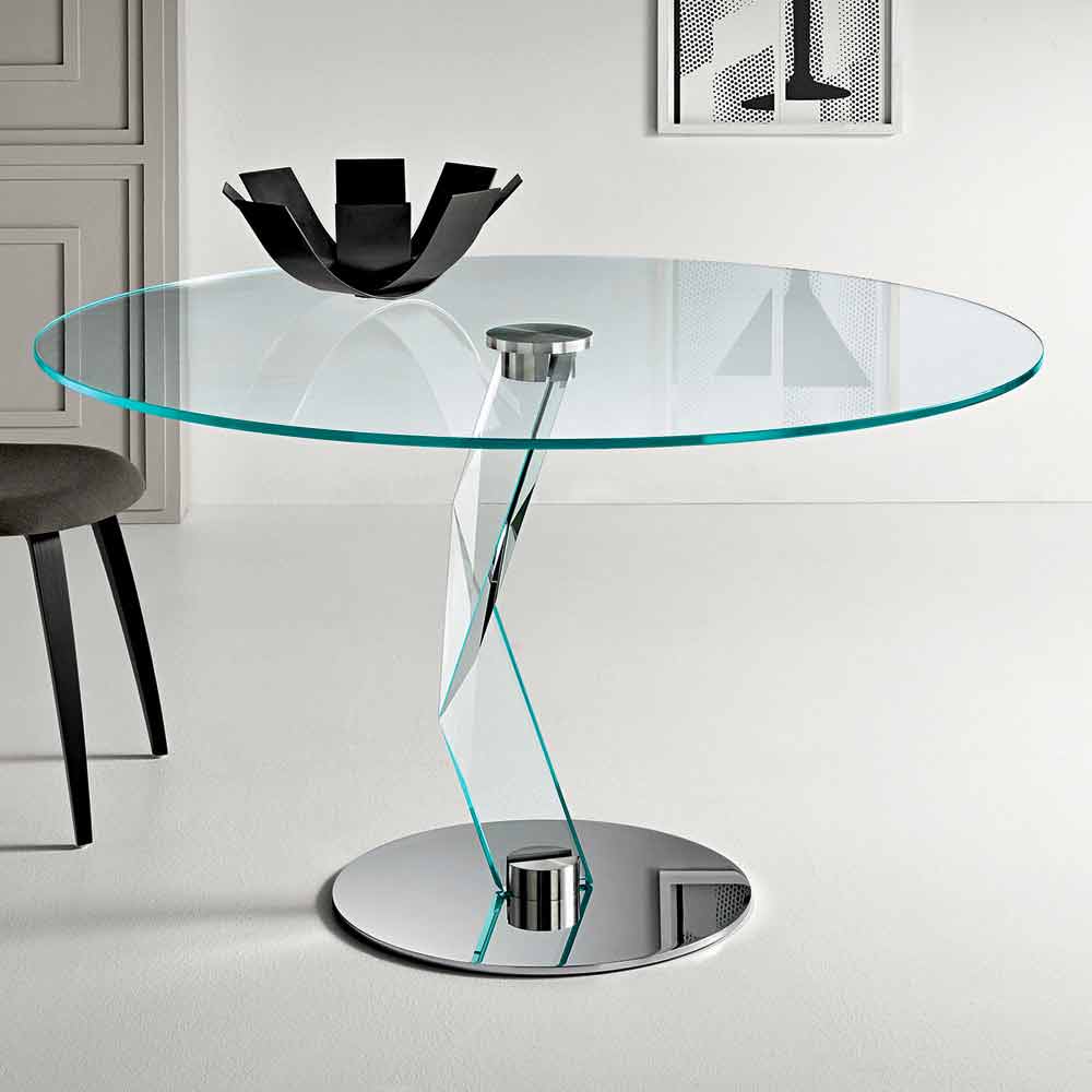 Kulatý kuchyňský stůl s extra čirým sklem a extra čirým sklem a chromovanou kovovou základnou moderního designu, vyrobené v Itálii.
