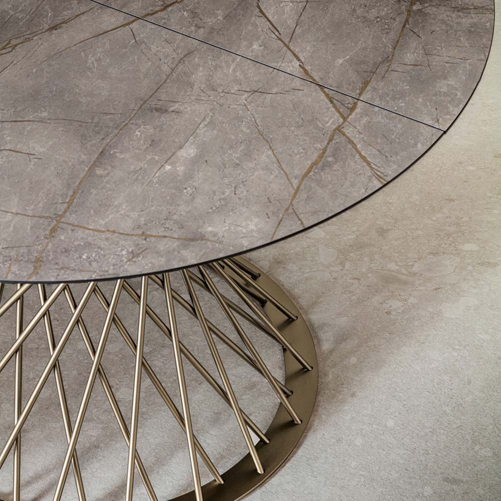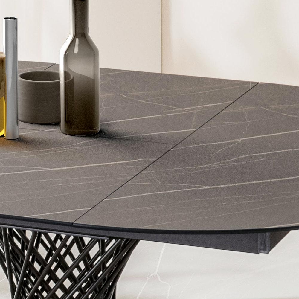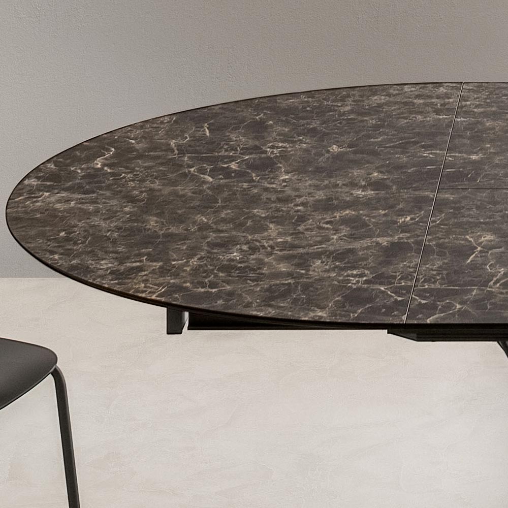 Vrchní deska z HPL nabízí vytříbený estetický vzhled s elegantní texturou a odolným povrchem. Centrální výsuvný mechanismus je praktický a diskrétní, ideální pro proměnu stolu v několika jednoduchých krocích a pohodlné ubytování pro více osob.