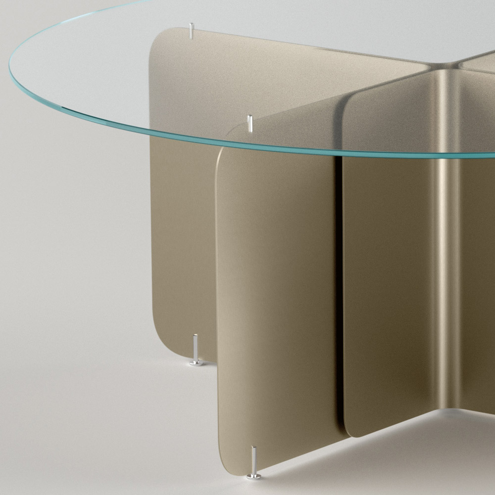 Tento stůl je okouzlujícím spojením minimalistické elegance a současné funkčnosti a je ideální pro ty, kteří hledají výrazný a zároveň decentní kus nábytku. Transparentní skleněný povrch nabízí úplný pohled na struktury pod ním, přičemž geometrické základy jsou v odstínech šampaňského.