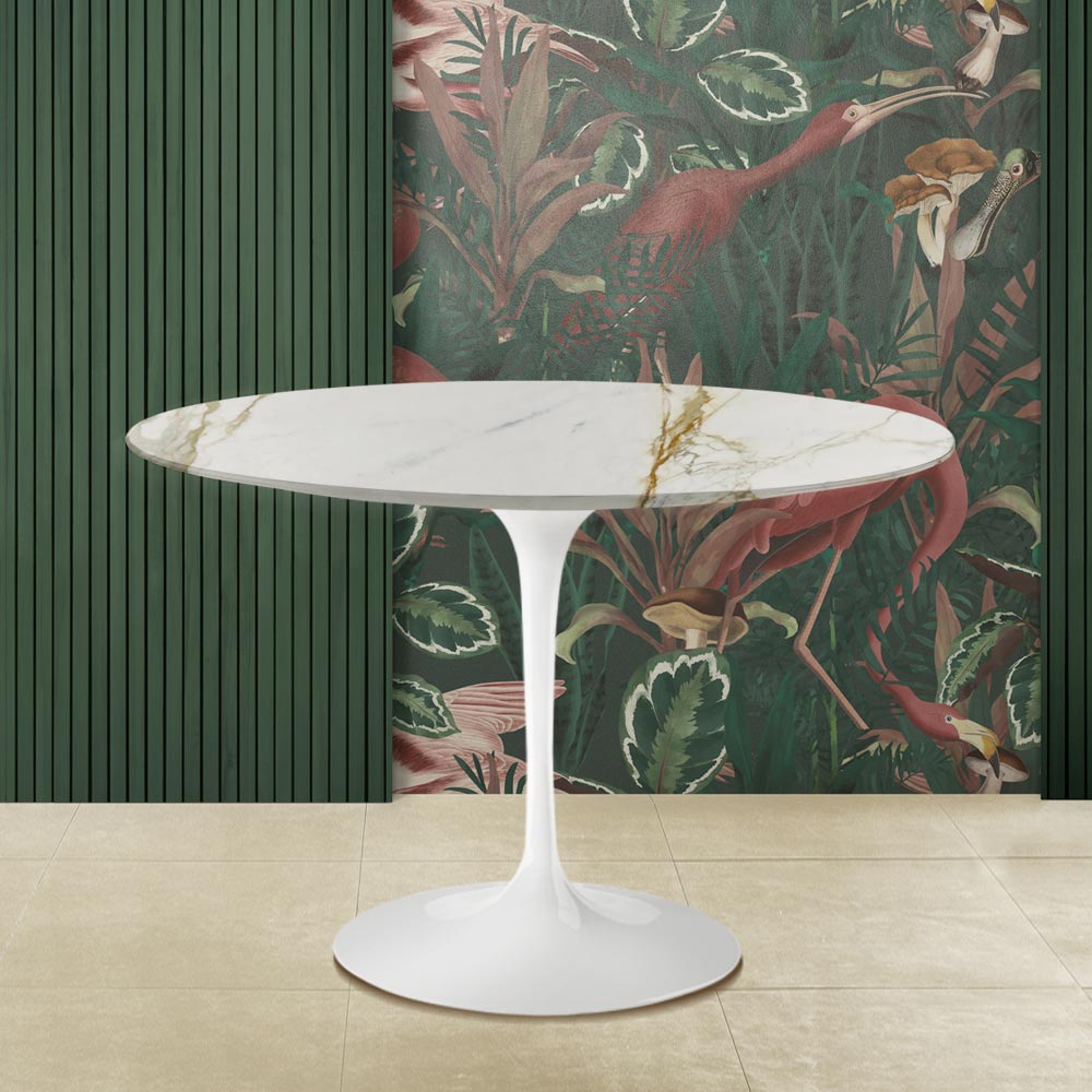 Jídelní stůl s kulatou deskou ze zlatého mramoru calacatta a podstavou z leštěného hliníku vyrobený v Itálii