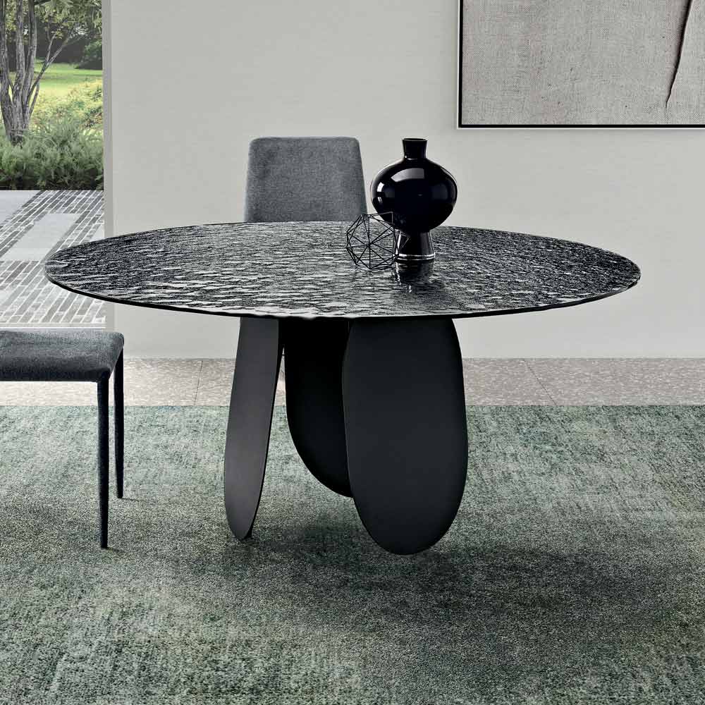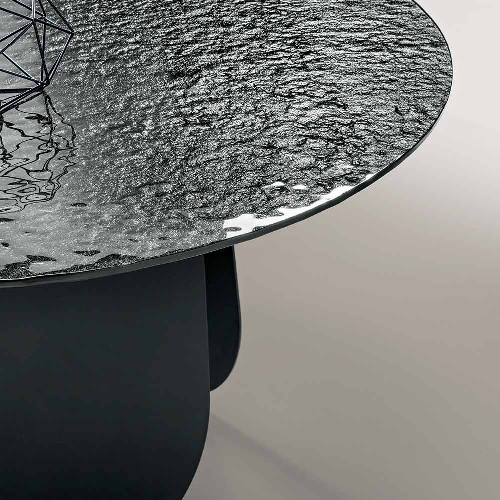 Rafinovaný kulatý stůl vyrobený v Itálii , navržený tak, aby vylepšil jídelnu nebo obývací pokoj moderním a dramatickým estetickým dojmem. Skleněná deska s tepaným povrchem a stříbrným povrchem odráží světlo s duhovými efekty, čímž prostoru dodává jas a charakter.