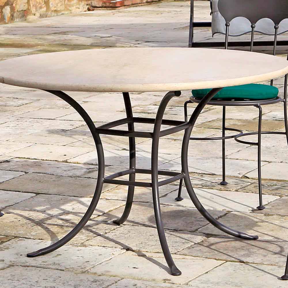 Ručně vyrobený jídelní stůl s kulatou deskou z travertinu Made in Italy.
