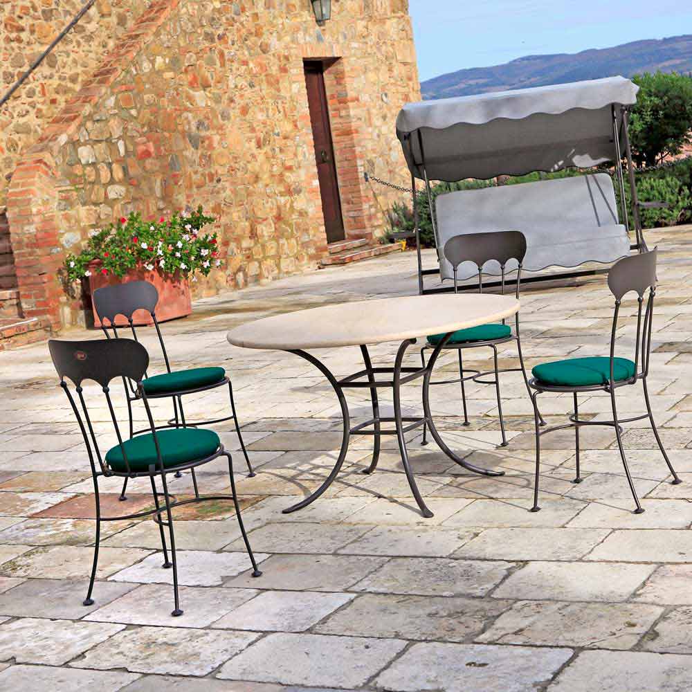 Venkovní jídelní stůl vyrobený v Itálii s antracitovou povrchovou úpravou, lakovaný železný podstavec a kulatá deska ze světlého travertinu . Nápad na vybavení, který připomíná klasičtější styl díky použití materiálů a končí starodávnou duší. Struktura nabízí produktu optimální stabilitu, zatímco žárové zinkování ho činí obzvláště odolným vůči jakémukoli druhu koroze, zaručuje odolnost proti korozi kovu po celá desetiletí a obohacuje jeho estetiku povlakem s hrubou strukturou, která zvyšuje starodávnou chuť formuláře. 100% italské řemeslné zpracování spolu s důrazem na detail ještě více podtrhuje jeho hodnotu a hodnotu, a nabízí tak vysoce kvalitní finální produkt schopný charakterizovat jakýkoli venkovní prostor díky své silné klasické osobnosti a eleganci bez času travertinového vrcholu, který dává stolu jeho staromódní estetika.