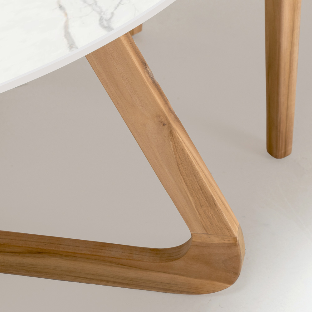 Dřevěná podnož nejenže pevně podpírá robustní keramickou desku stolu, ale také dodává nádech přirozeného tepla a vytváří podmanivý vizuální kontrast s lesklou mramorovou deskou. Tato kombinace je nejen esteticky příjemná , ale také nabízí trvanlivost a odolnost vůči povětrnostním vlivům , díky čemuž je stůl ideální pro každodenní venkovní použití.