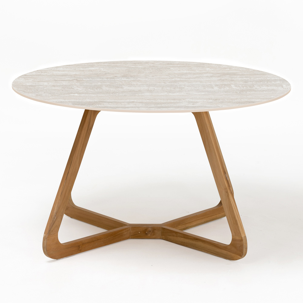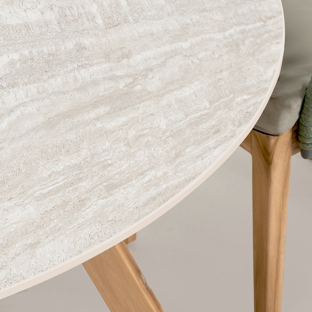vyrobený v Itálii. Tento venkovní stůl je bezchybnou volbou pro ty, kteří oceňují krásu nadčasových přírodních povrchových úprav. Kombinuje keramickou desku inspirovanou světlým travertinem s dřevěnou základnou, čímž vzniká kus venkovního nábytku, který je funkční i esteticky přitažlivý.